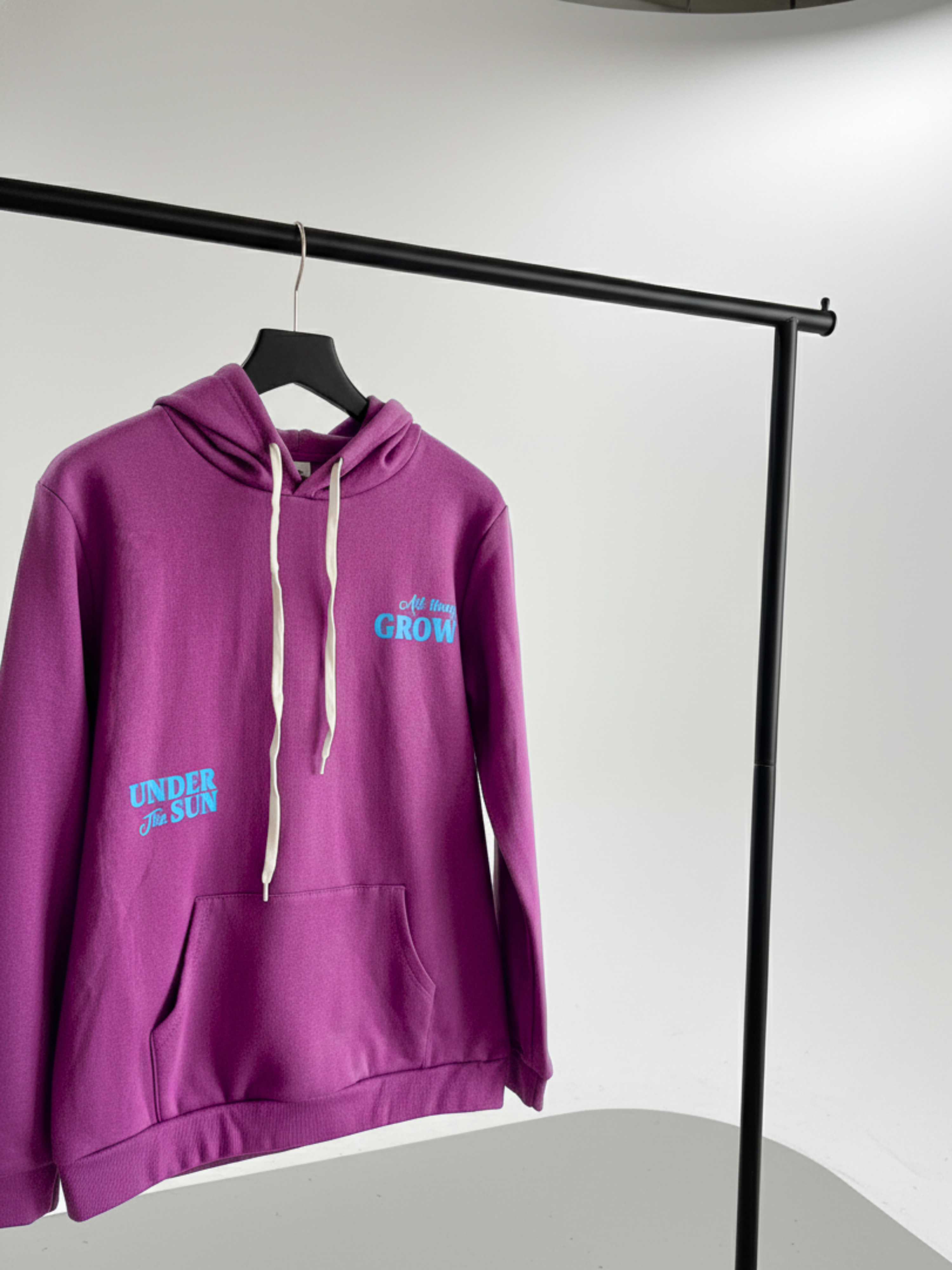 Buzo canguro de algodón frizado, corte OVERSIZE. Estampa en la espalda. Cordón ajustable en capucha