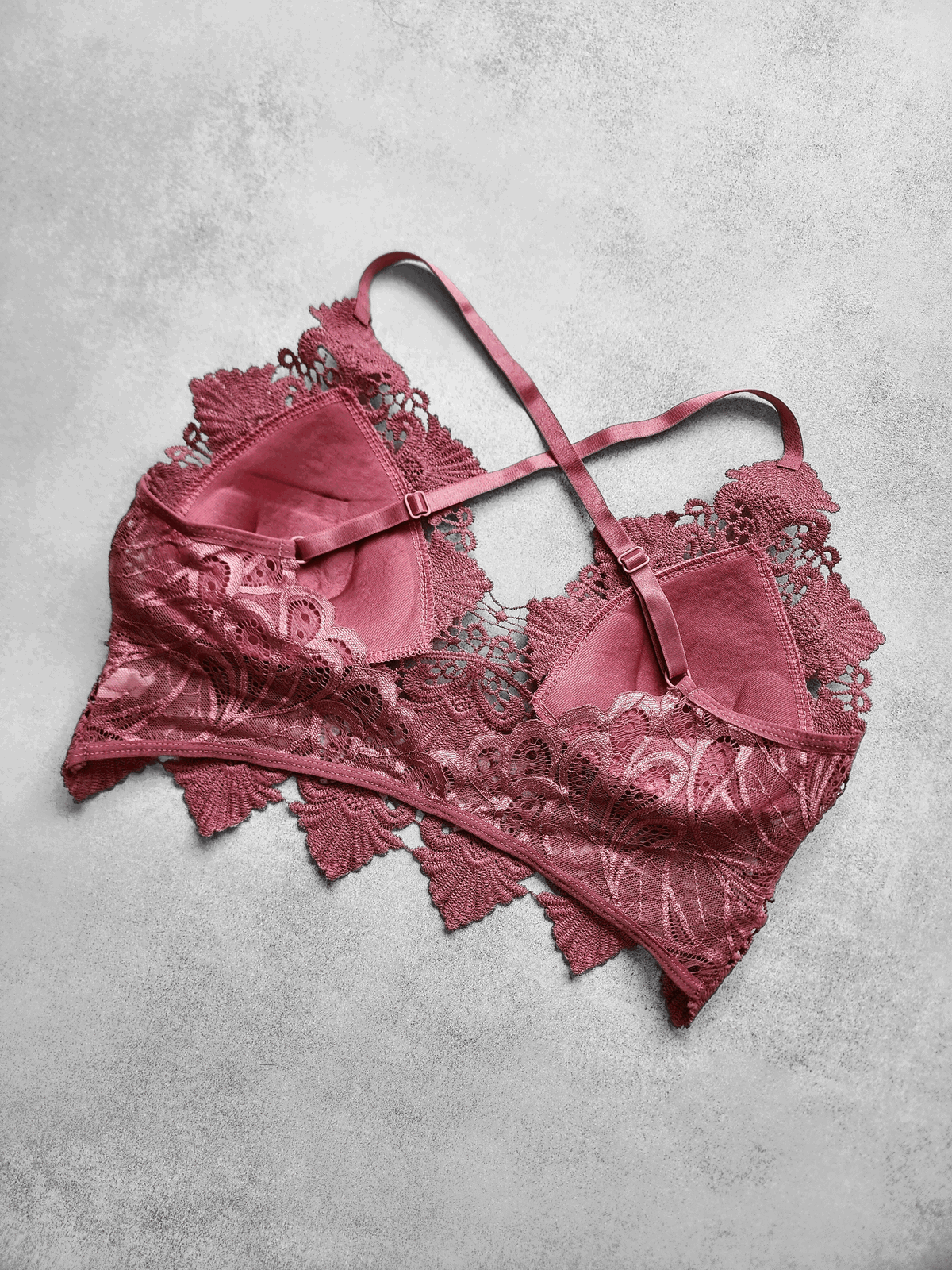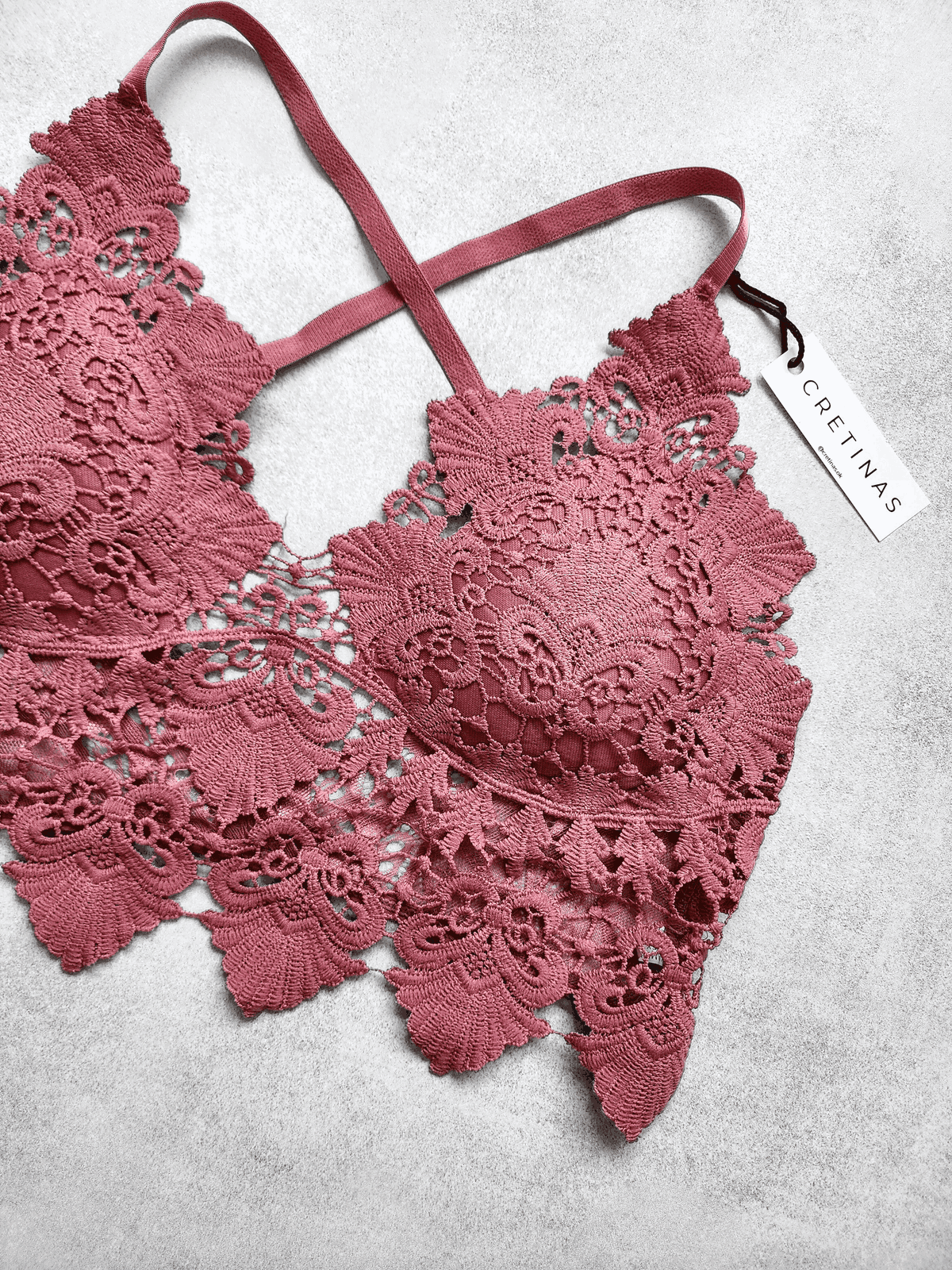 Bordado con tazas fijas y breteles regulables. Espalda cruzada con detalle en encaje.