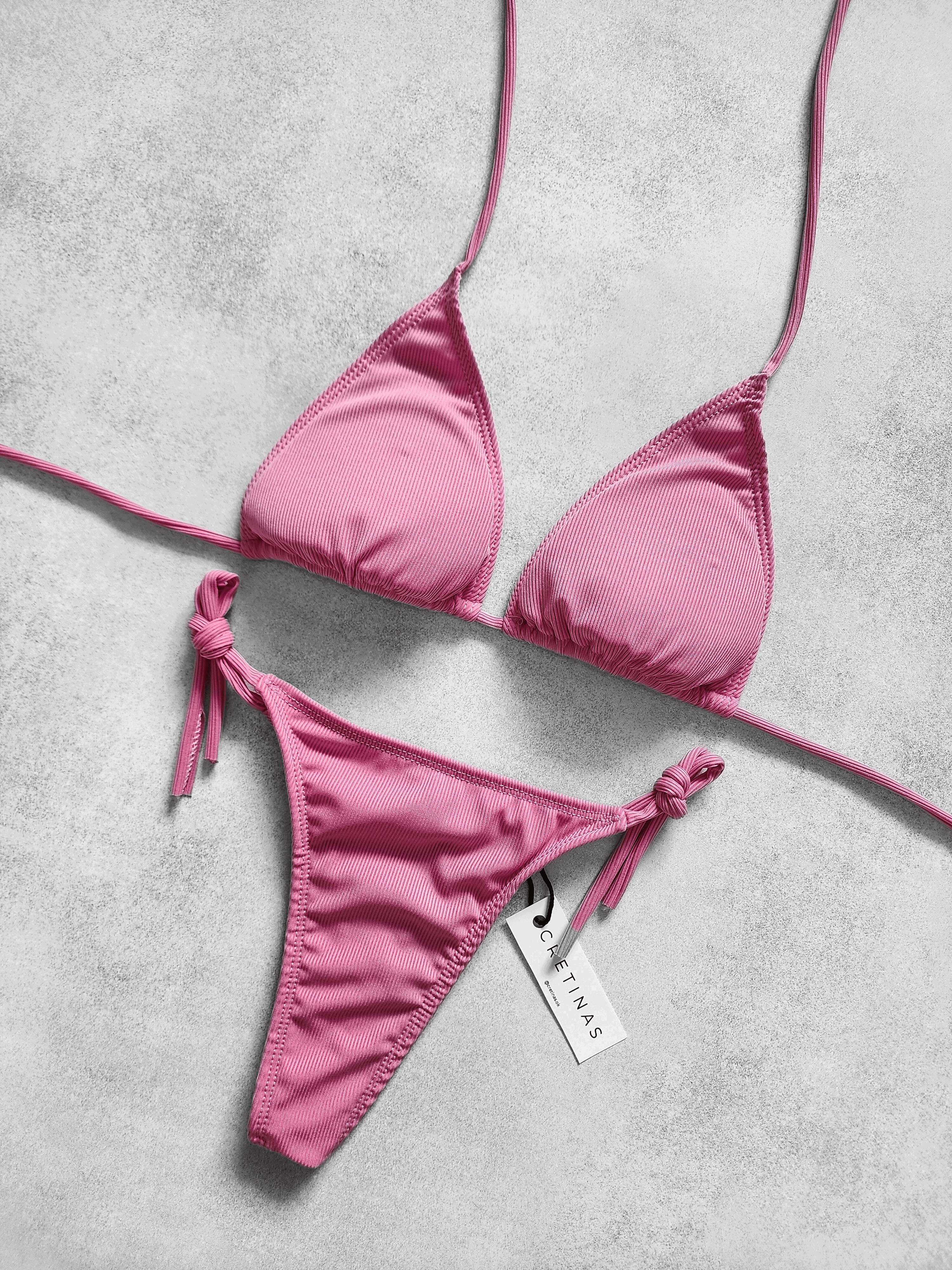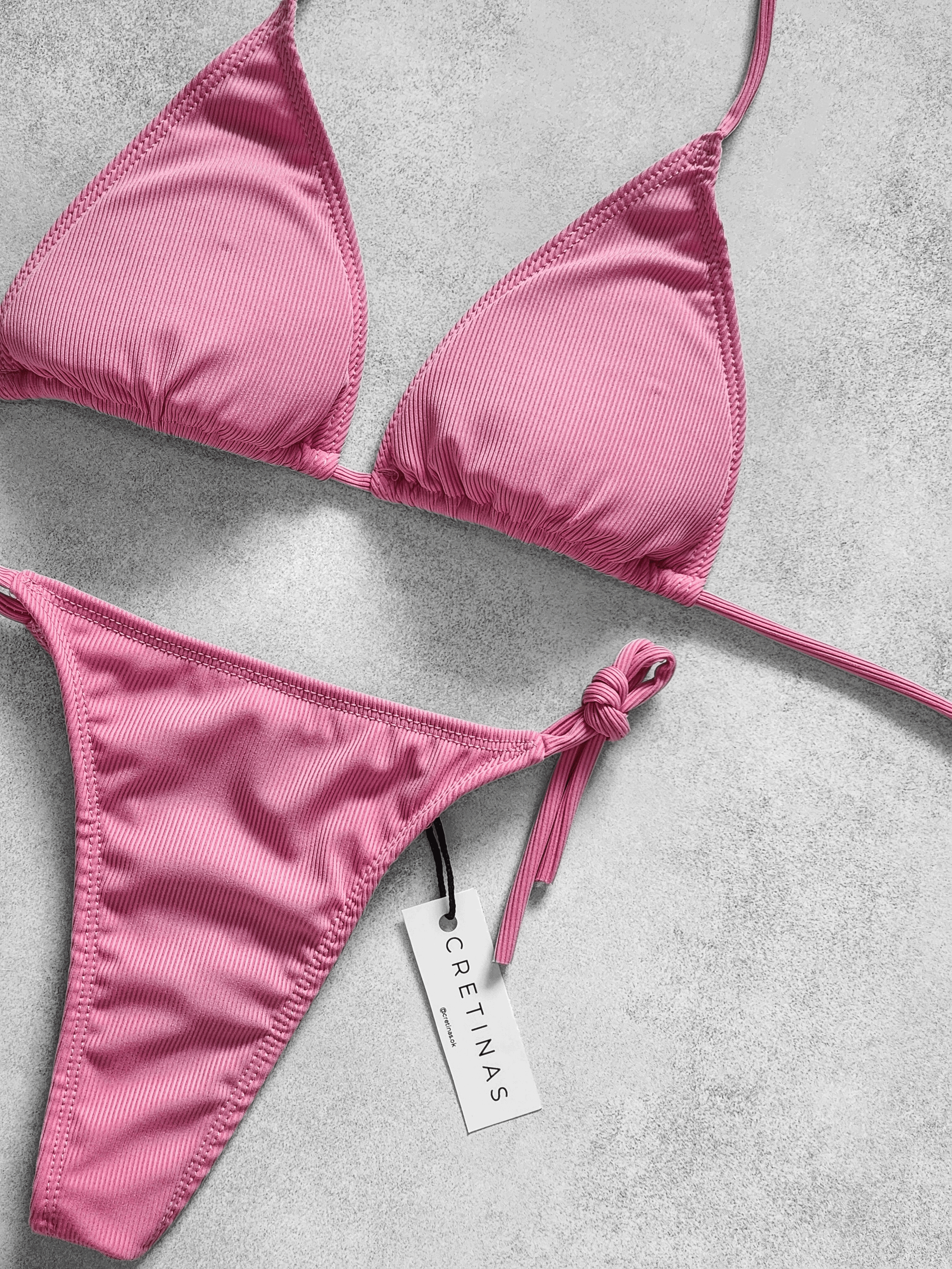 Conjunto morlay lycra. Corpiño triángulo con tazas desmontables. Less para atar