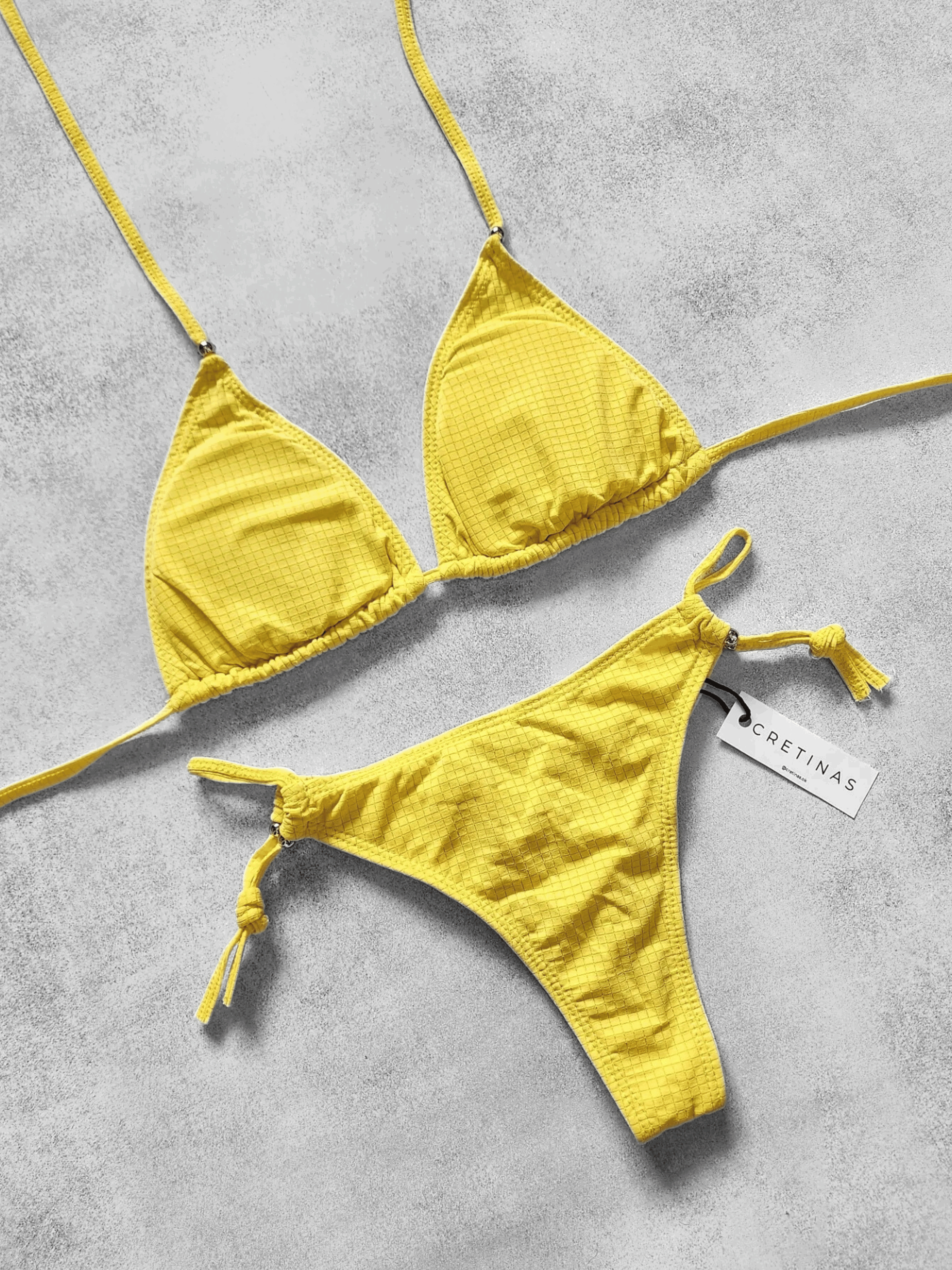 Conjunto lycra texturada. Corpiño para atar con tazas desmontables. Less regulable/atar doble tira.