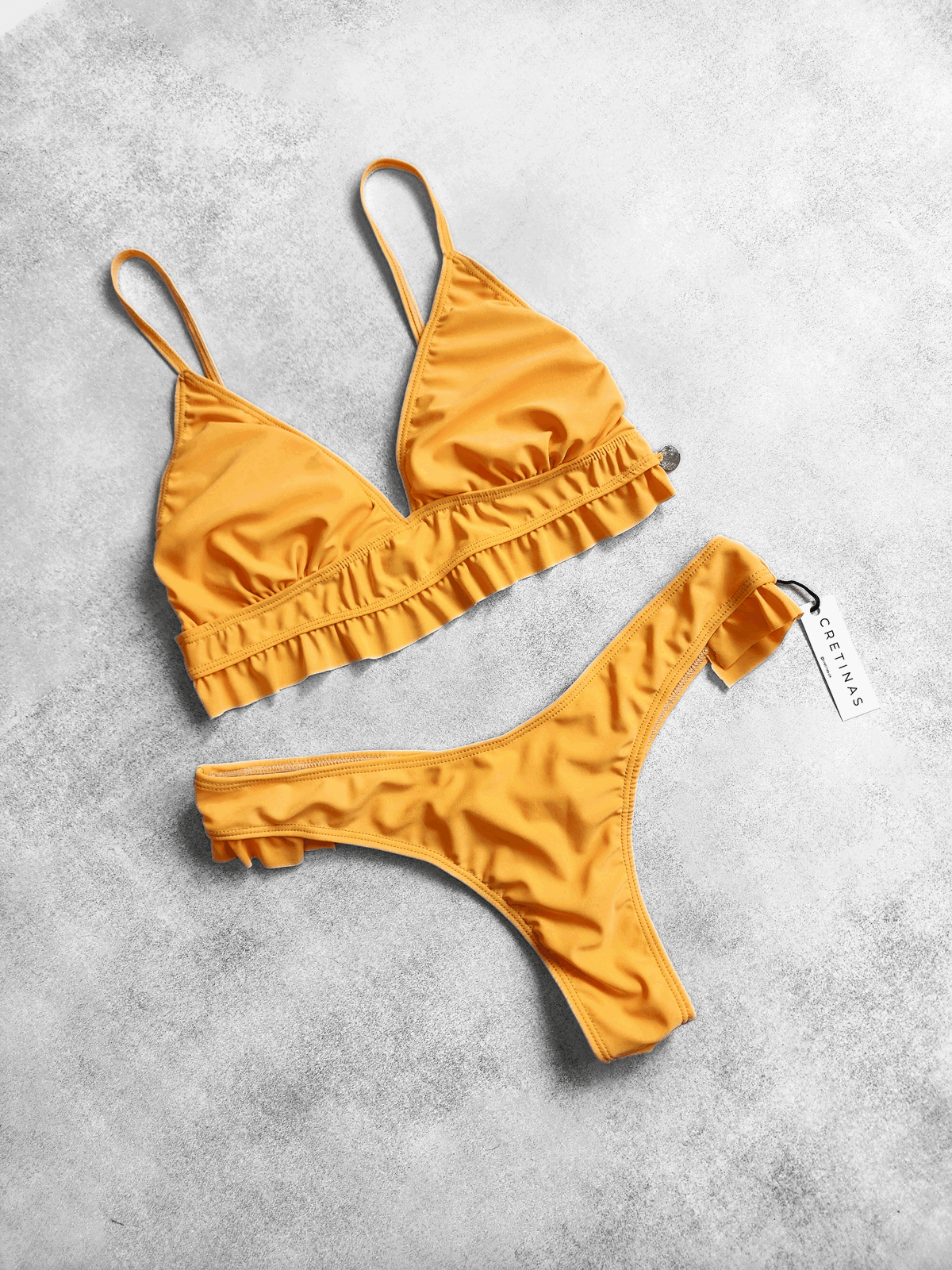 Conjunto de primera calidad con voladitos. Corpiño triángulo con tazas desmontables, breteles regulables y broche para prender en espalda.