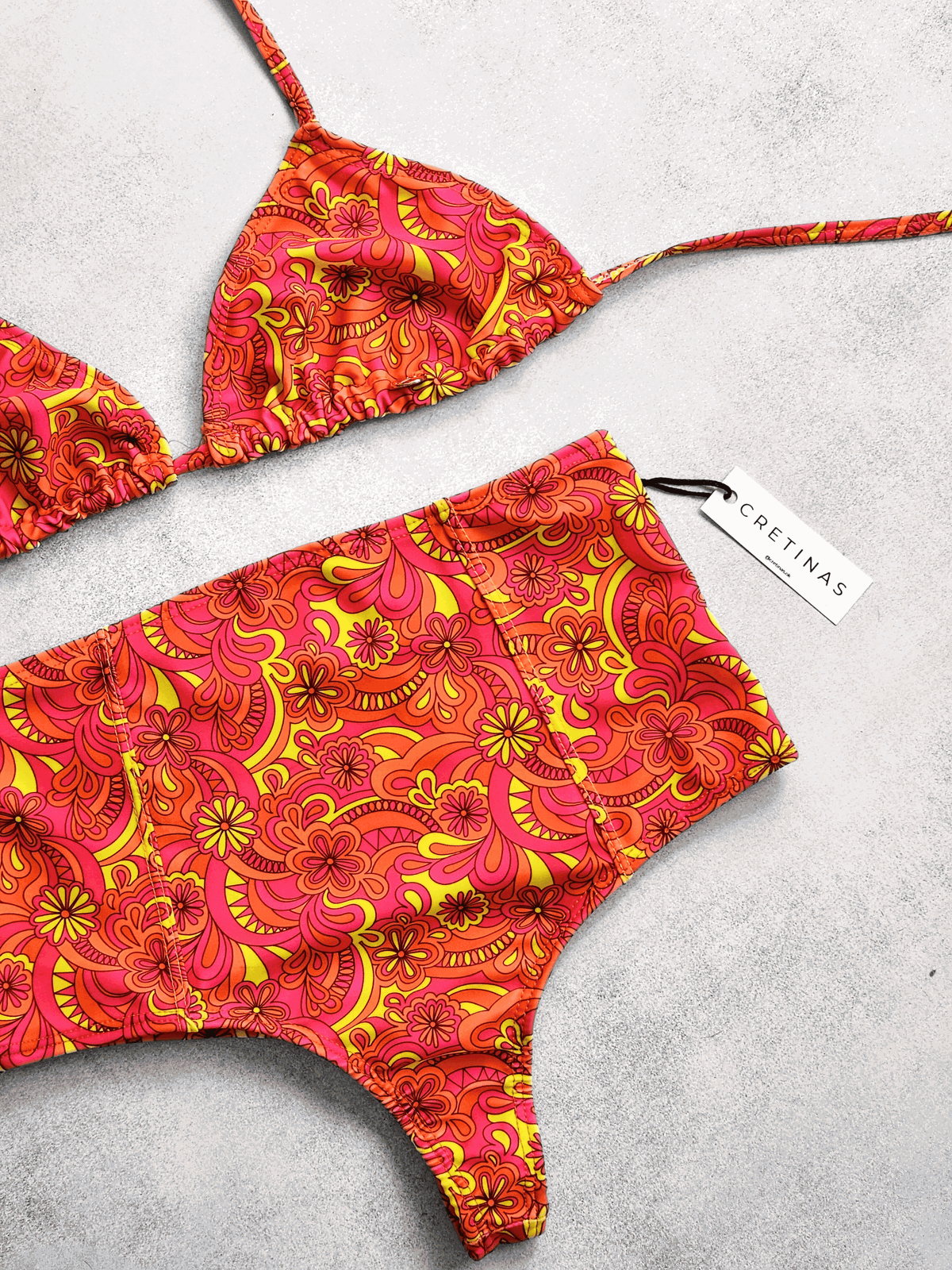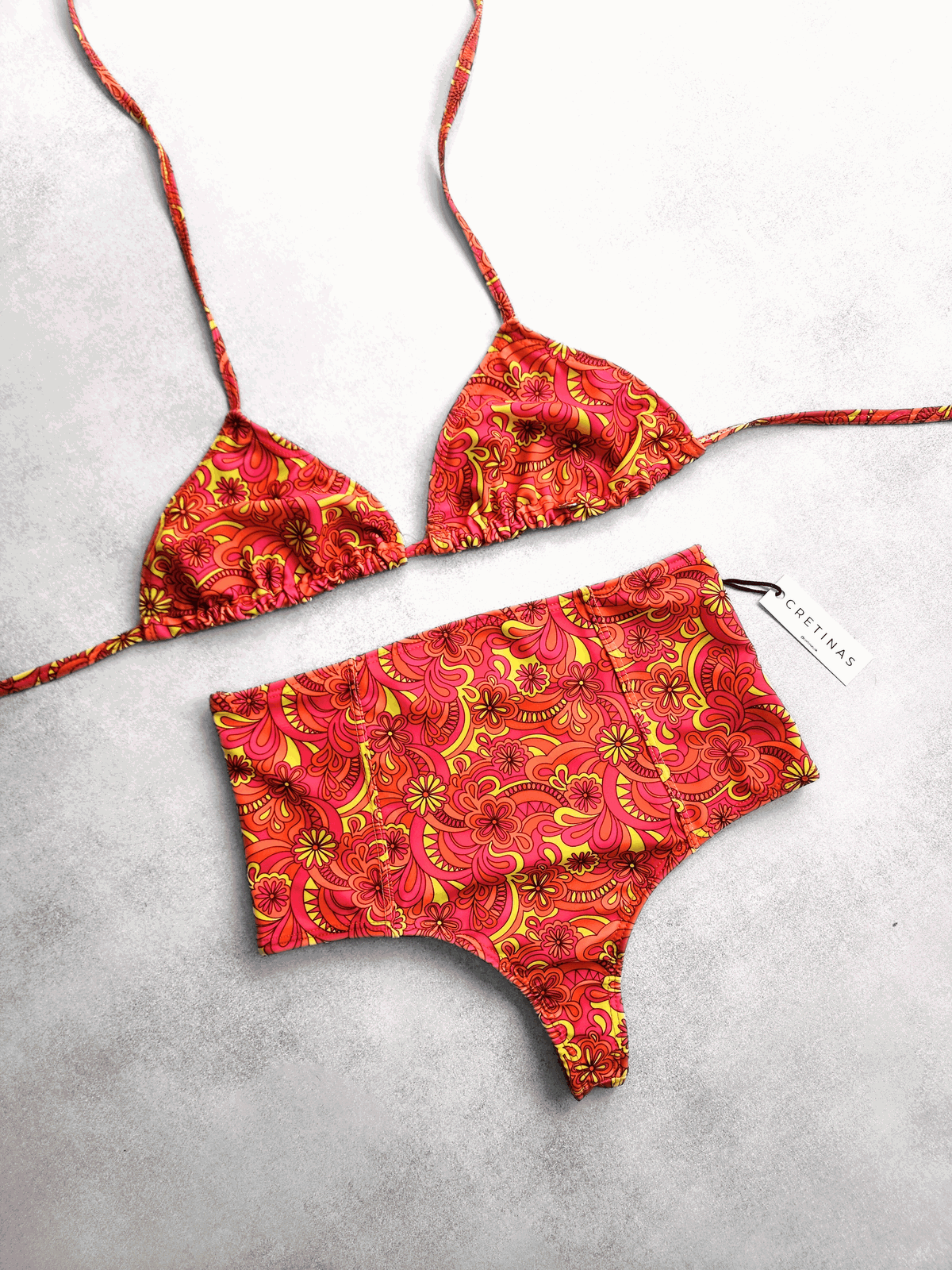 Conjunto de primera calidad tiro alto. Corpiño triángulo para atar sin tazas. Bombi colaless tiro alto.
