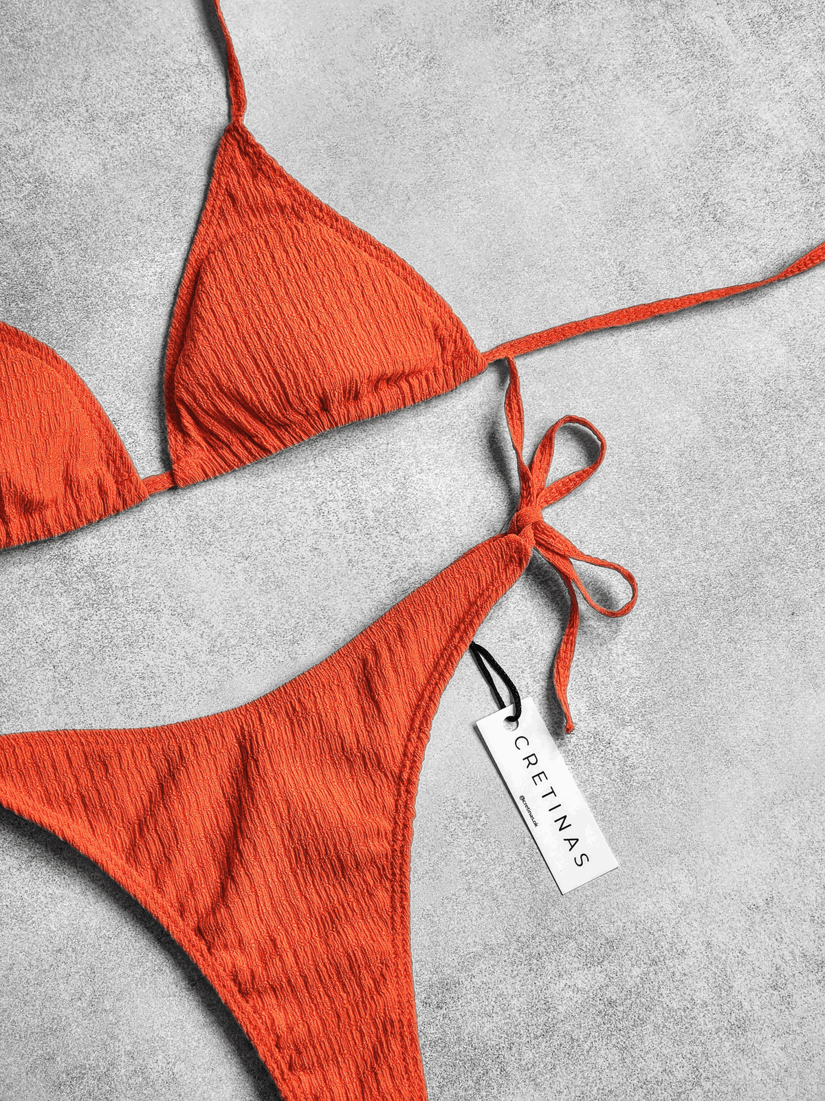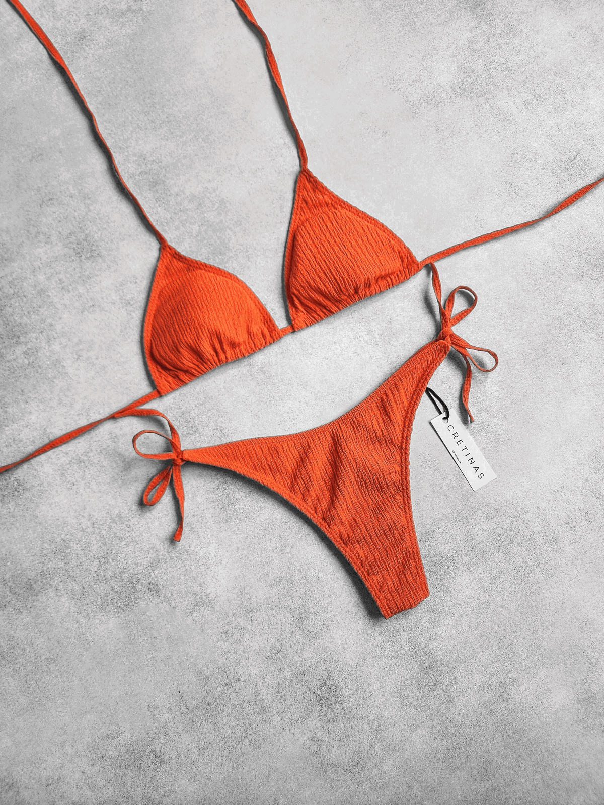 Conjunto texturado bambula. Corpiño triángulo para atar con tazas desmontable. Bombi less para atar