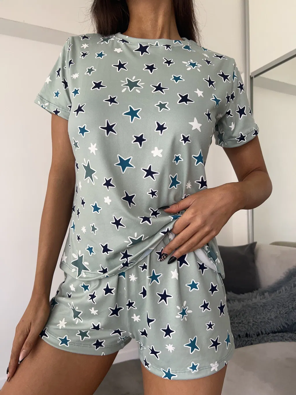 Conjunto modal con lycra, brilla en la oscuridad. Remera mangas cortas con short