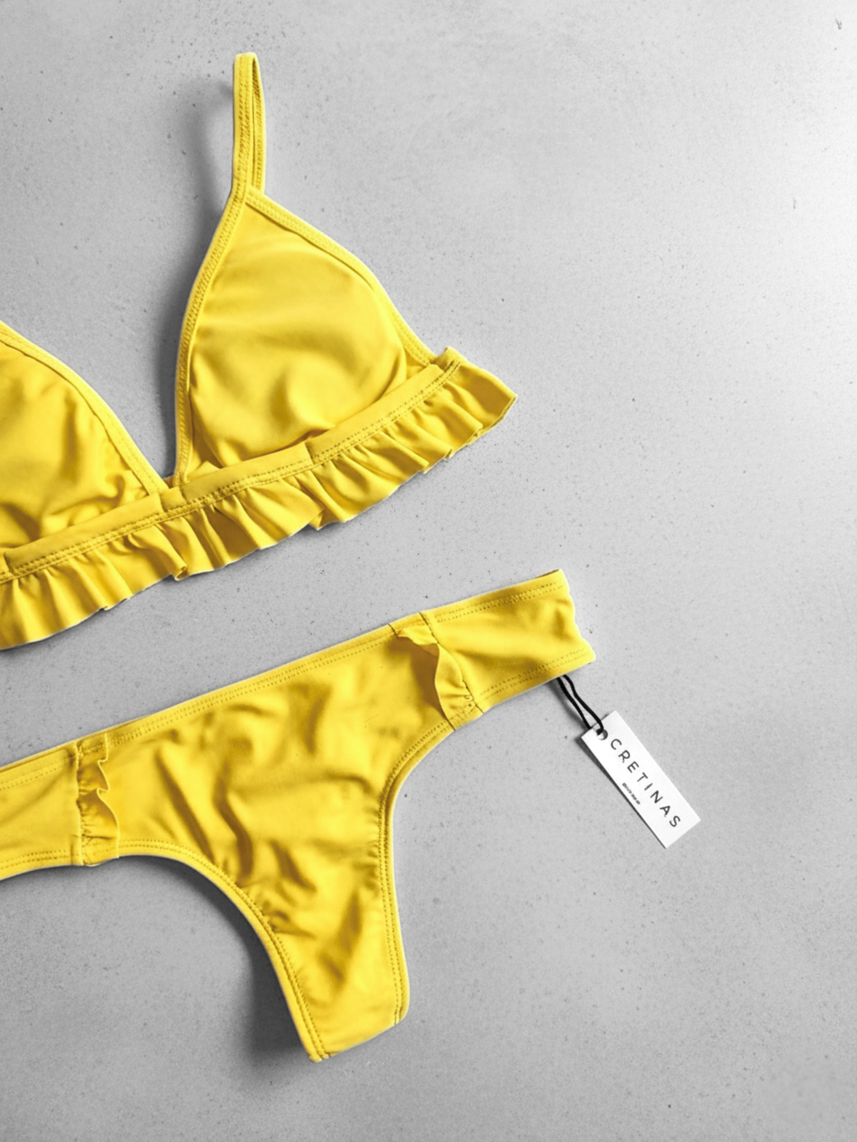 Conjunto de primera calidad con voladitos. Corpiño triángulo con tazas desmontables, breteles regulables y broche para prender en espalda. Bombi colaless