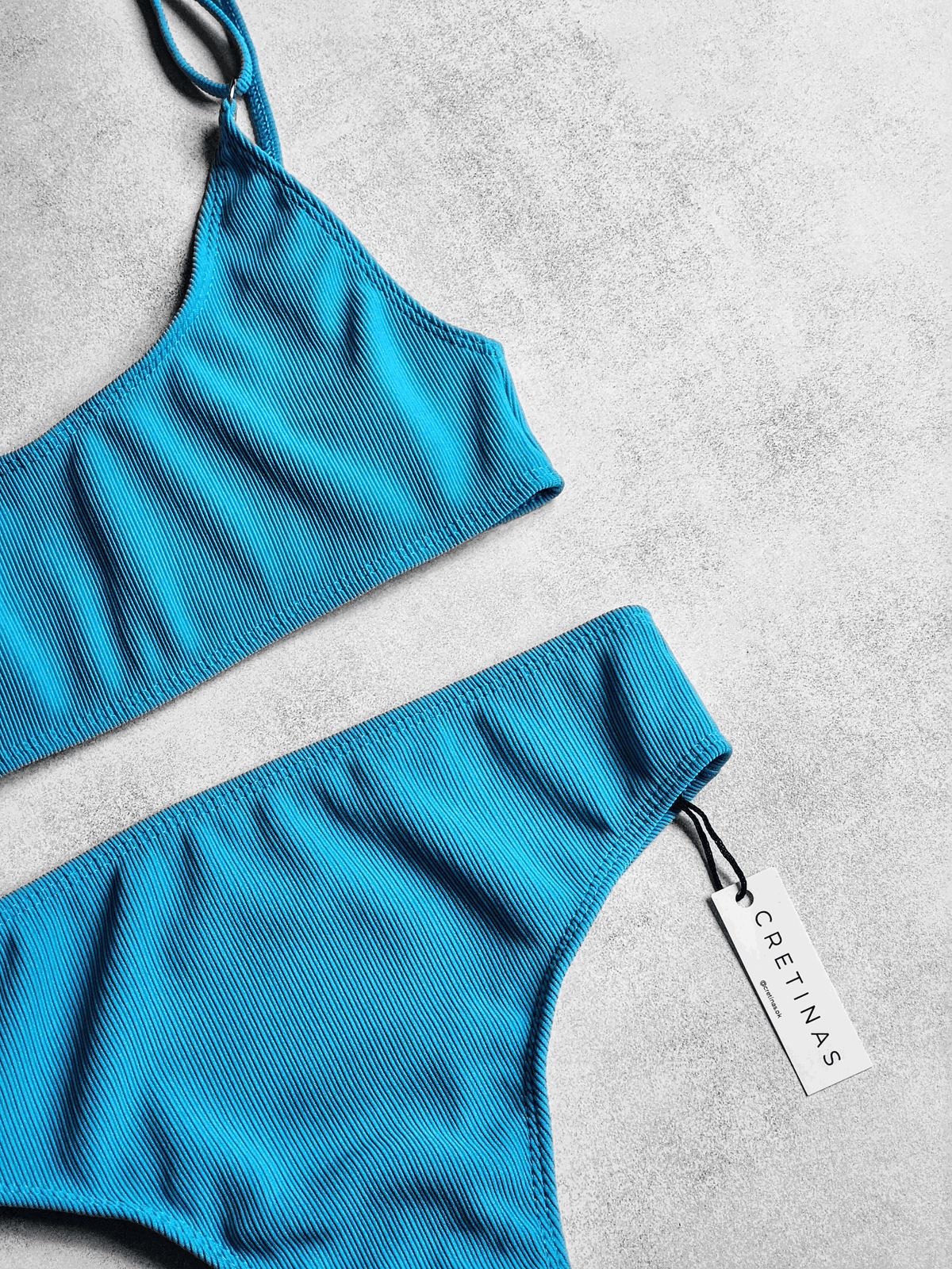 Conjunto texturado tipo morley grueso. Corpiño bando con breteles regulables y tazas desmontables. Bombi colaless tiro alto