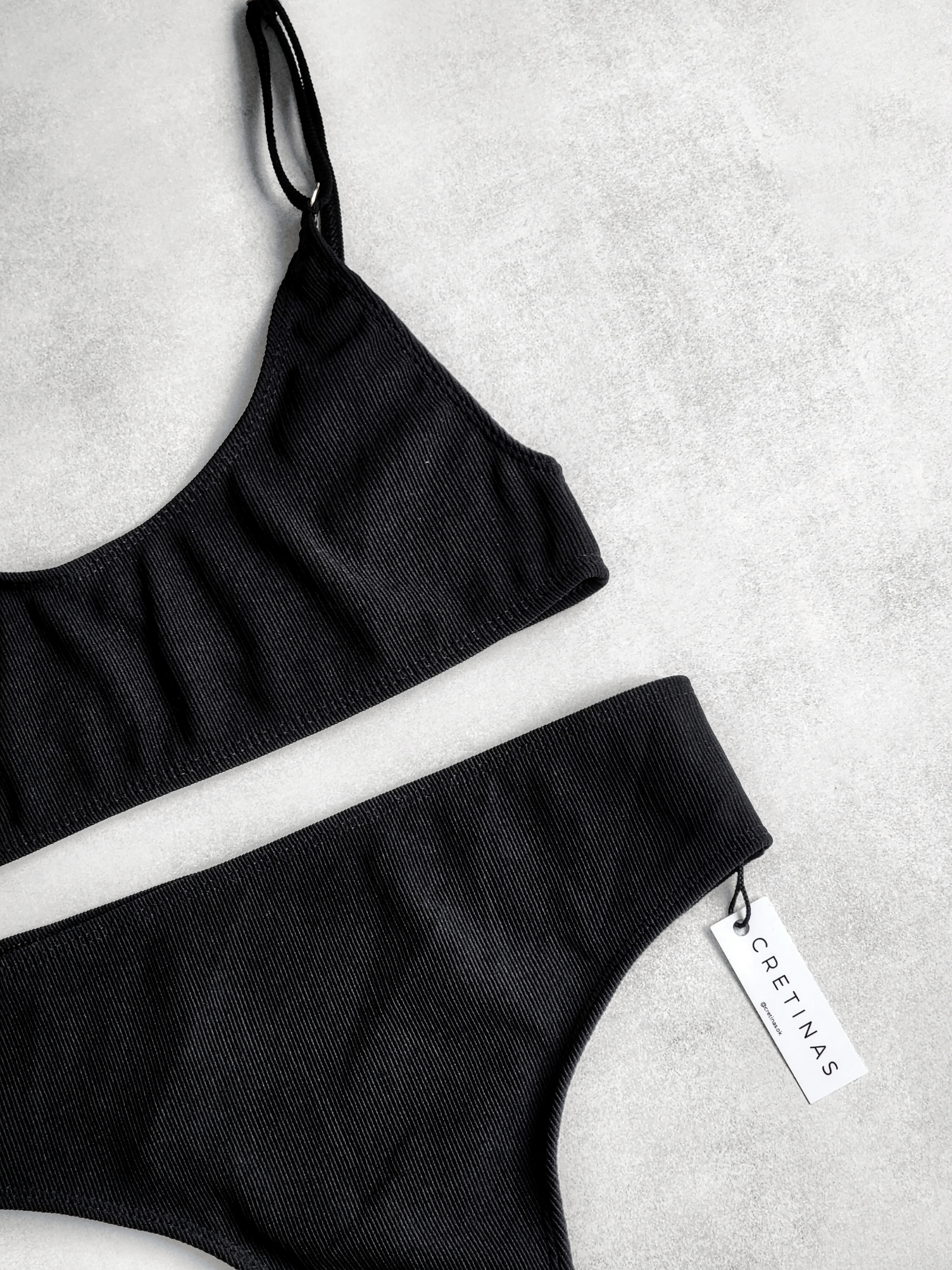 Conjunto texturado tipo morley grueso. Corpiño bando con breteles regulables y tazas desmontables. Bombi colaless tiro alto