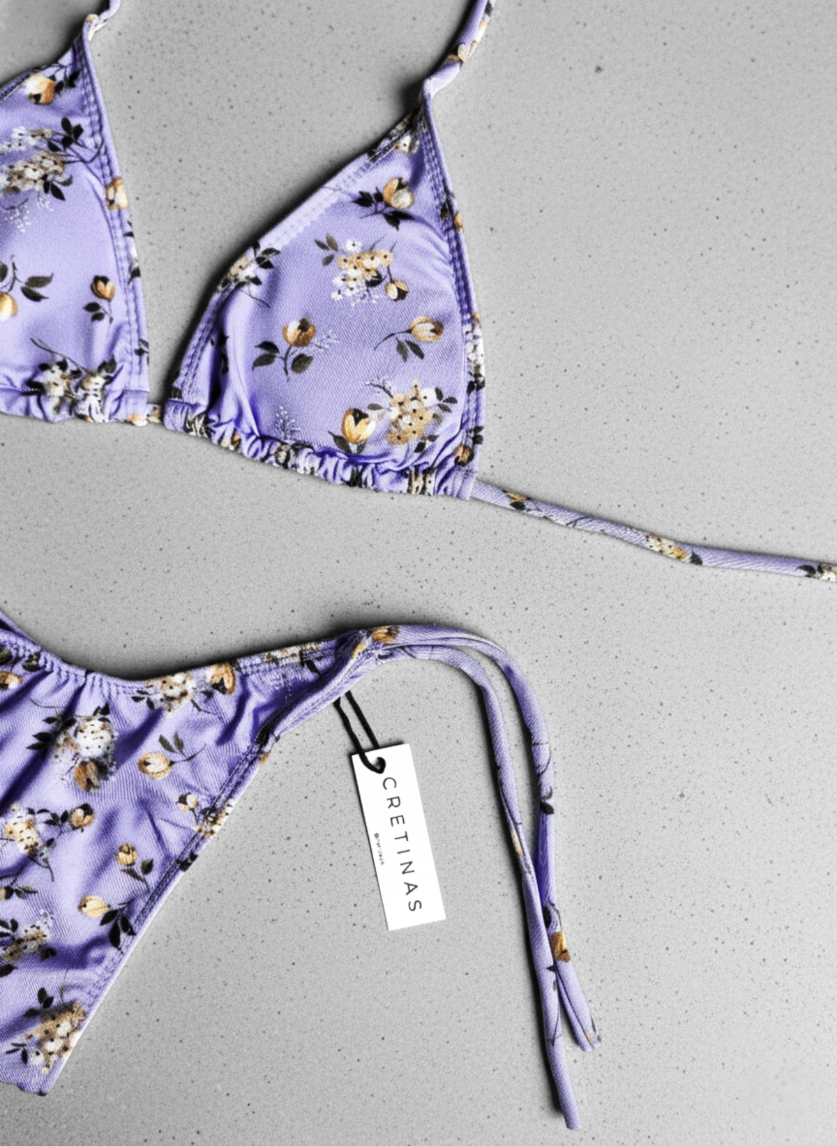 Conjunto estampado. Corpiño triángulo para atar con tazas desmontables. Bombi less para atar