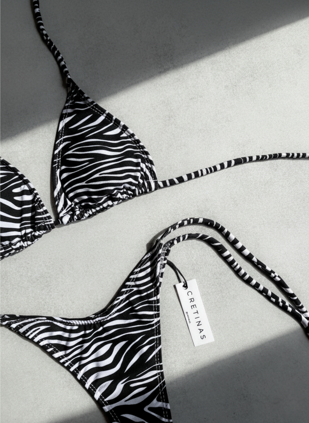 Conjunto estampado. Corpiño triángulo para atar con tazas desmontables. Bombi less para atar