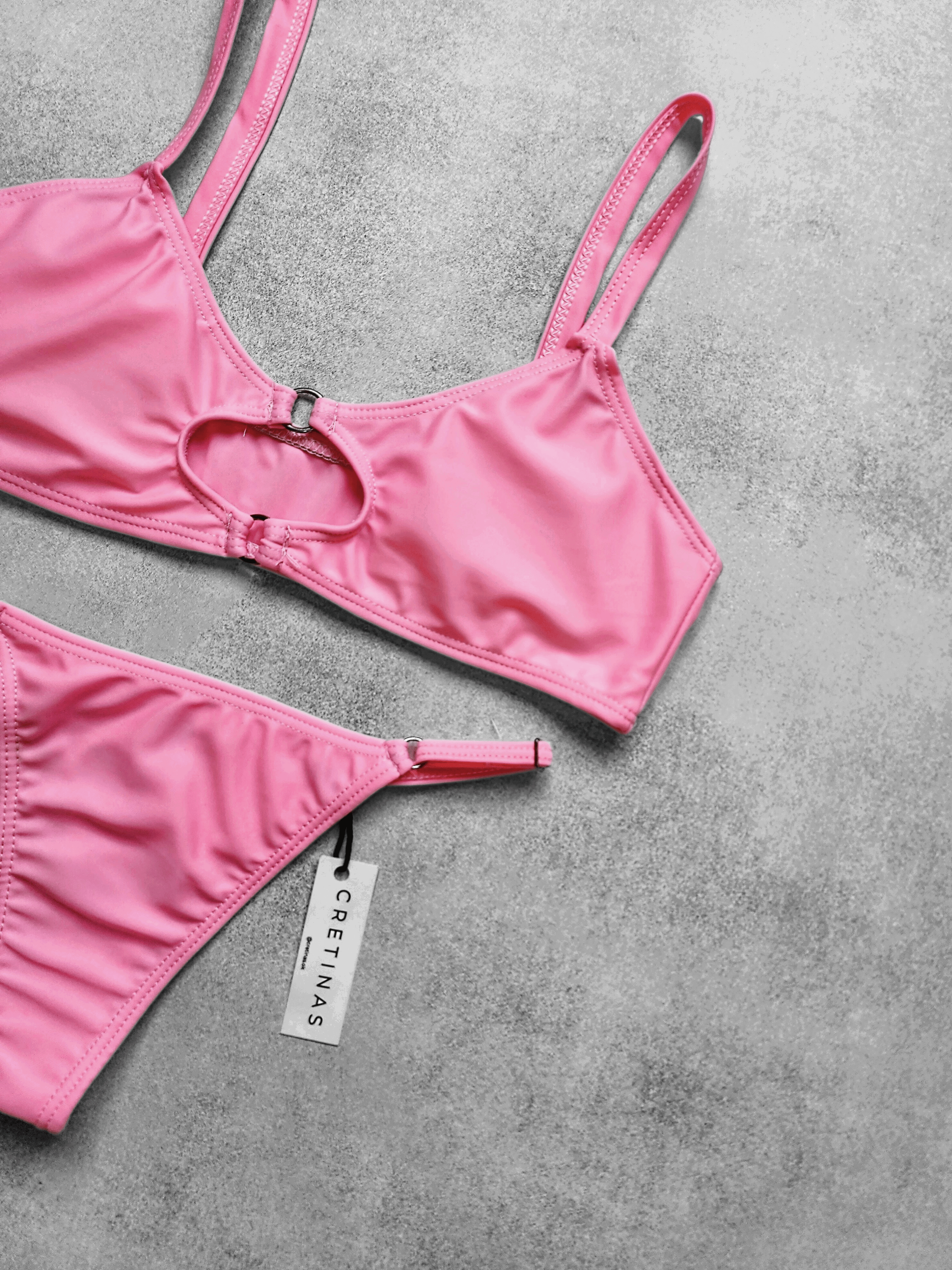 Conjunto liso. Corpiño top con argollitas y apertura en el centro, tazas desmontables. Bombi less regulable.
