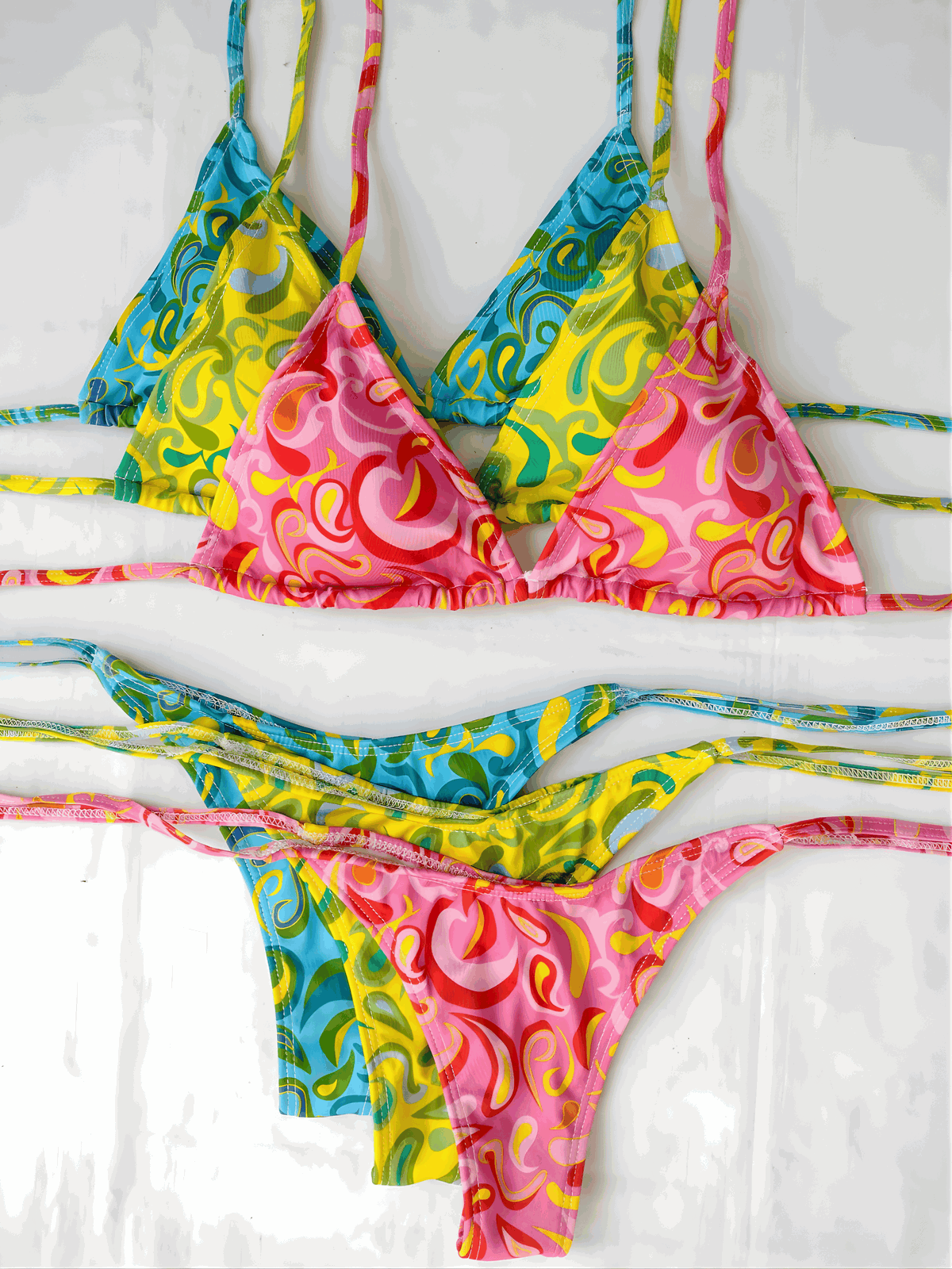 Conjunto estampado. Corpiño triángulo para atar con tazas desmontables. Bombi colaless para atar.