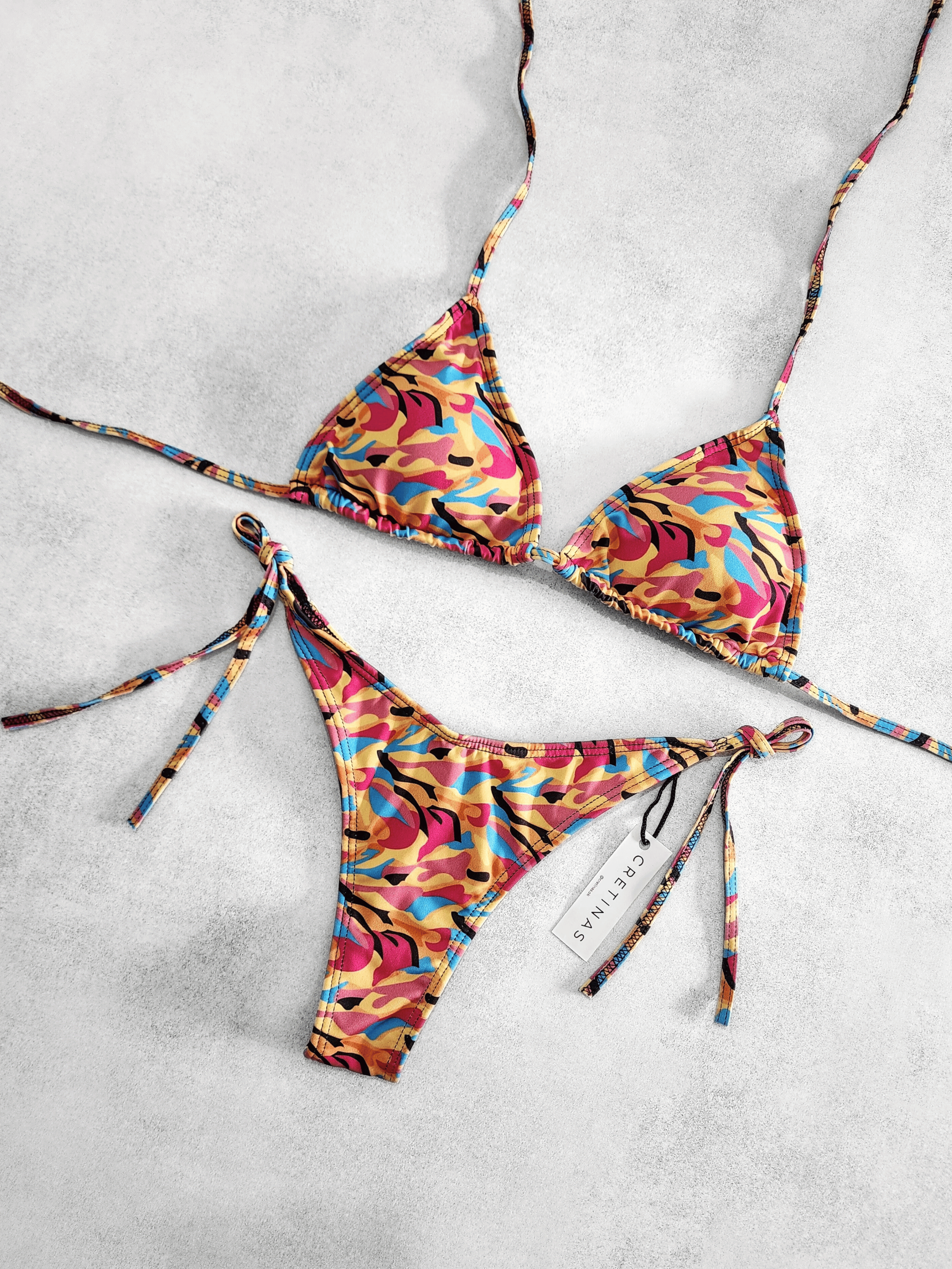 Conjunto estampado. Corpiño triángulo para atar con tazas desmontables. Bombi colaless para atar.