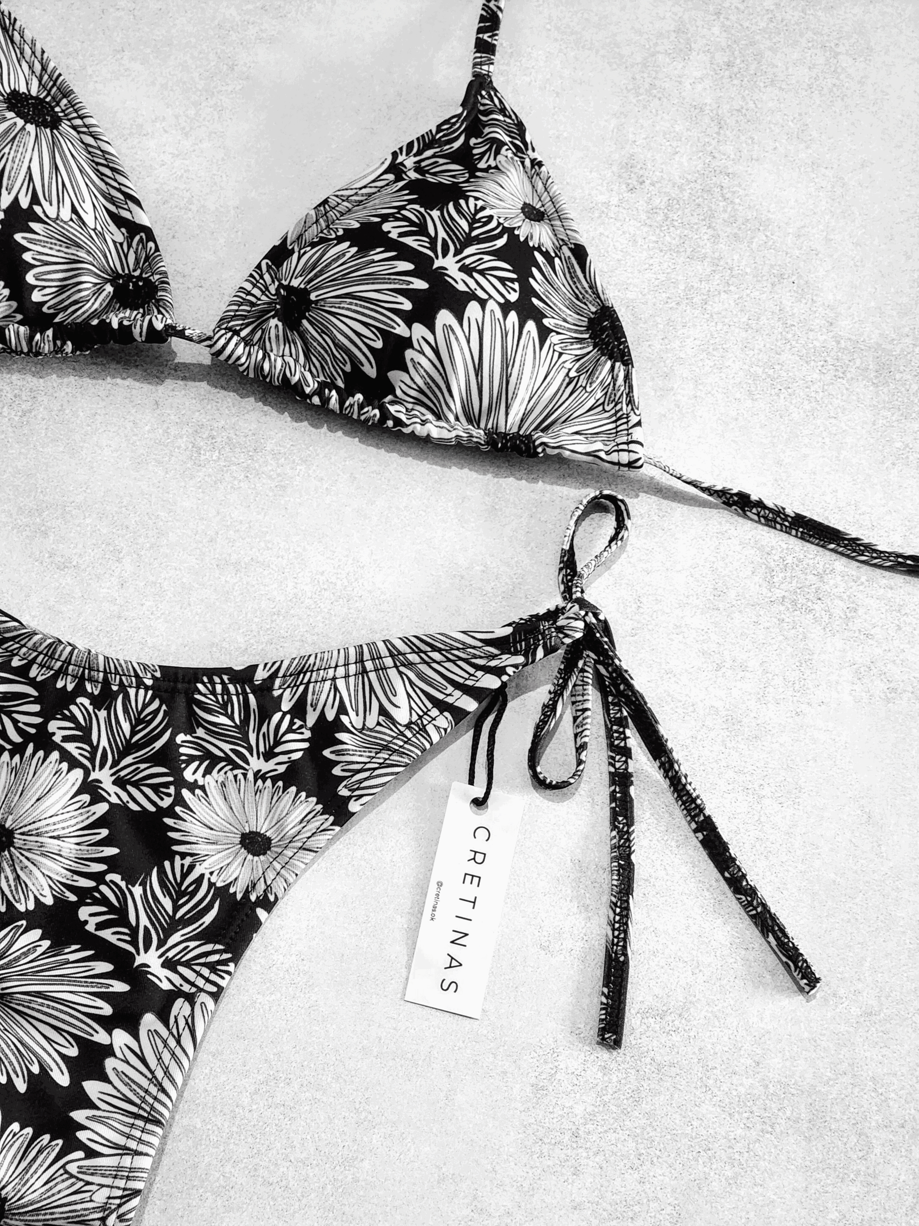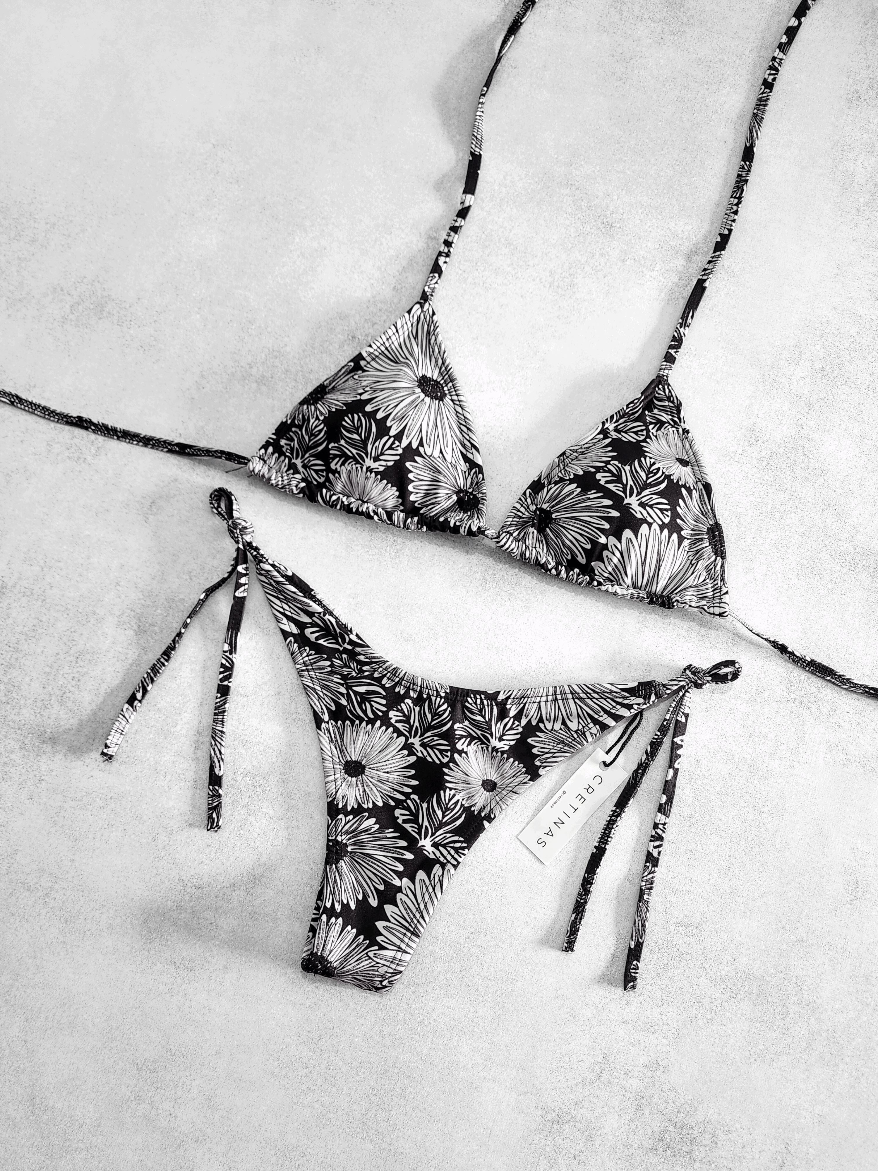 Conjunto estampado. Corpiño triángulo para atar con tazas desmontables. Bombi colaless para atar.