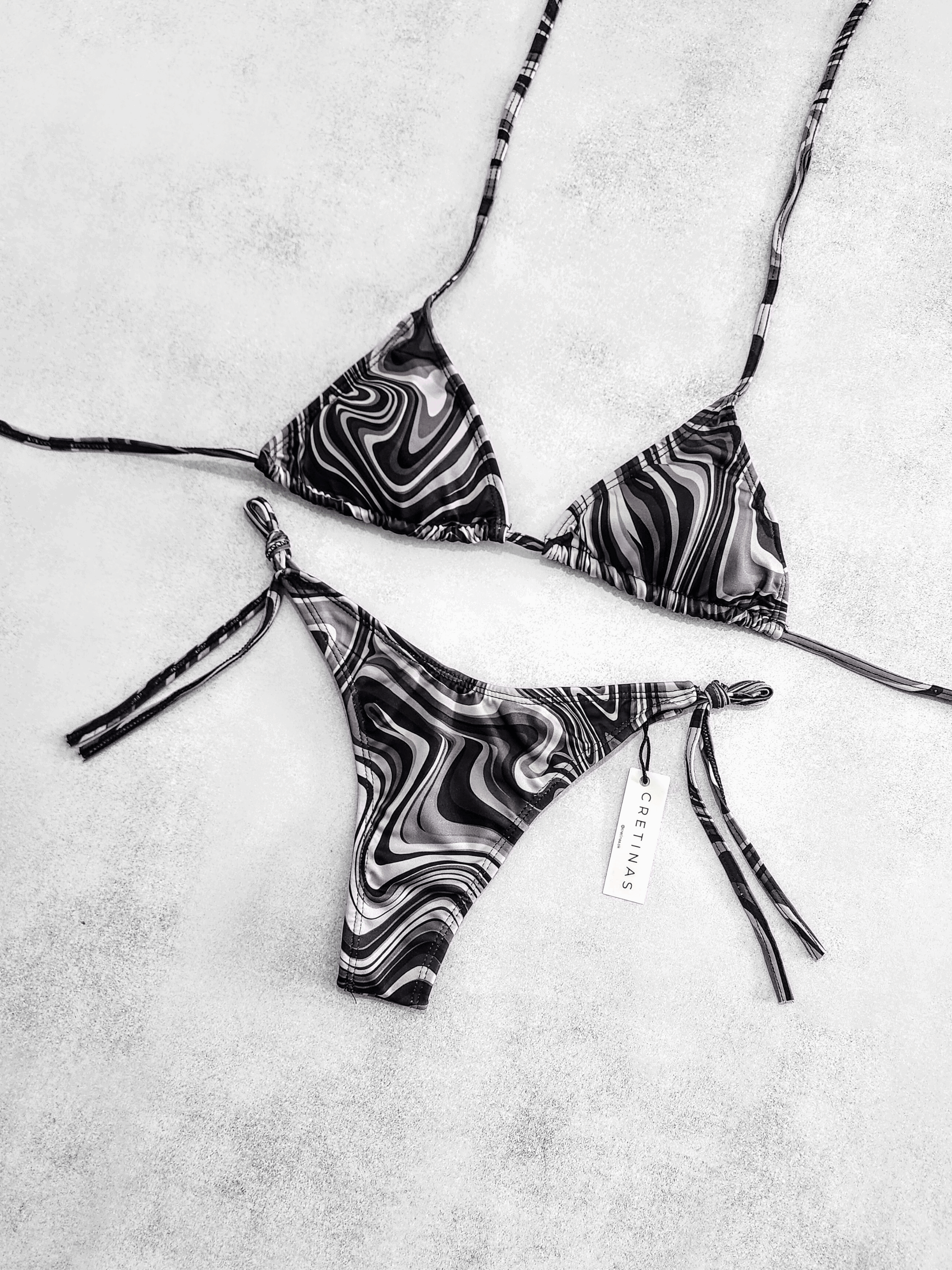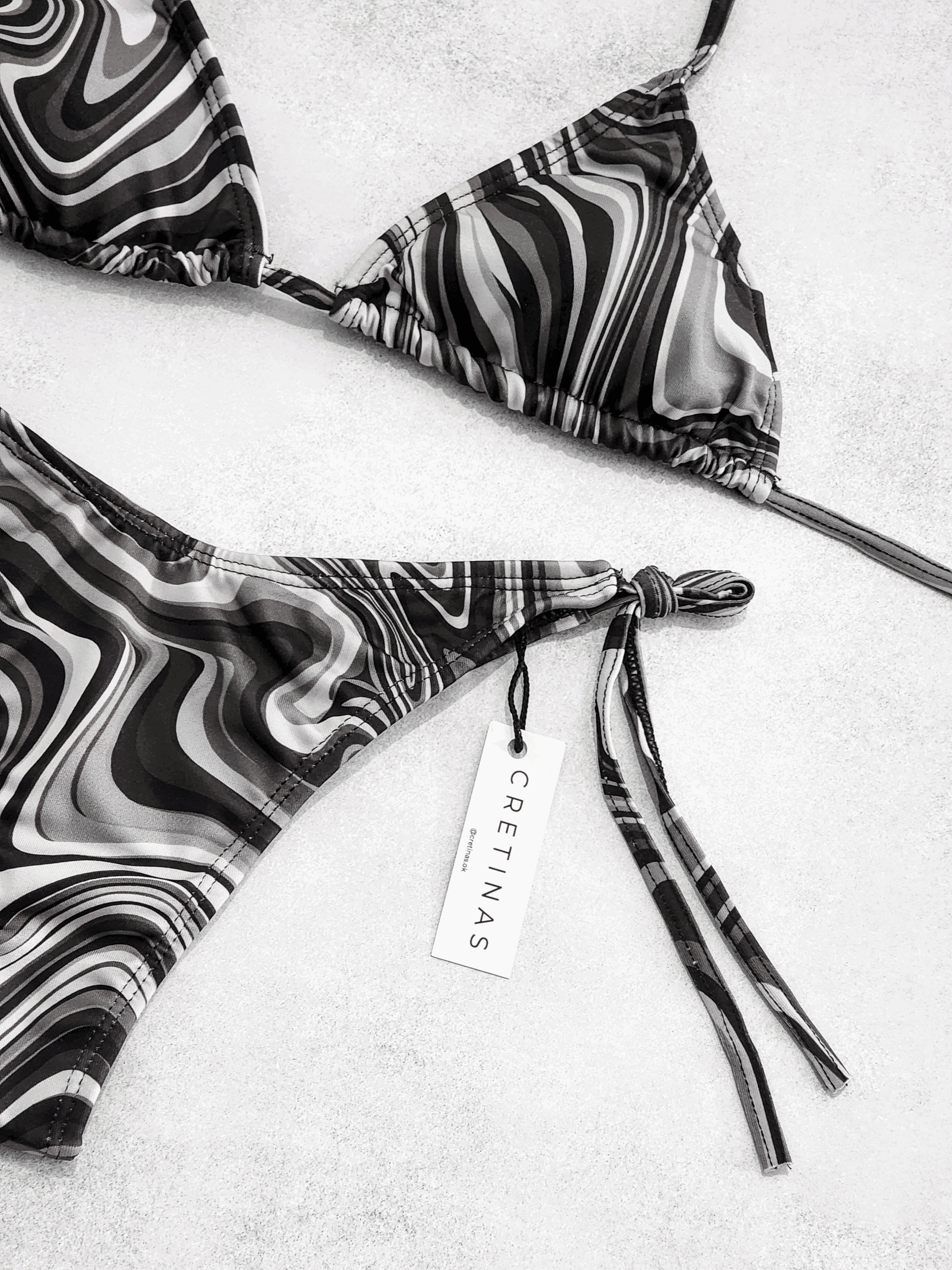 Conjunto estampado. Corpiño triángulo para atar con tazas desmontables. Bombi colaless para atar.