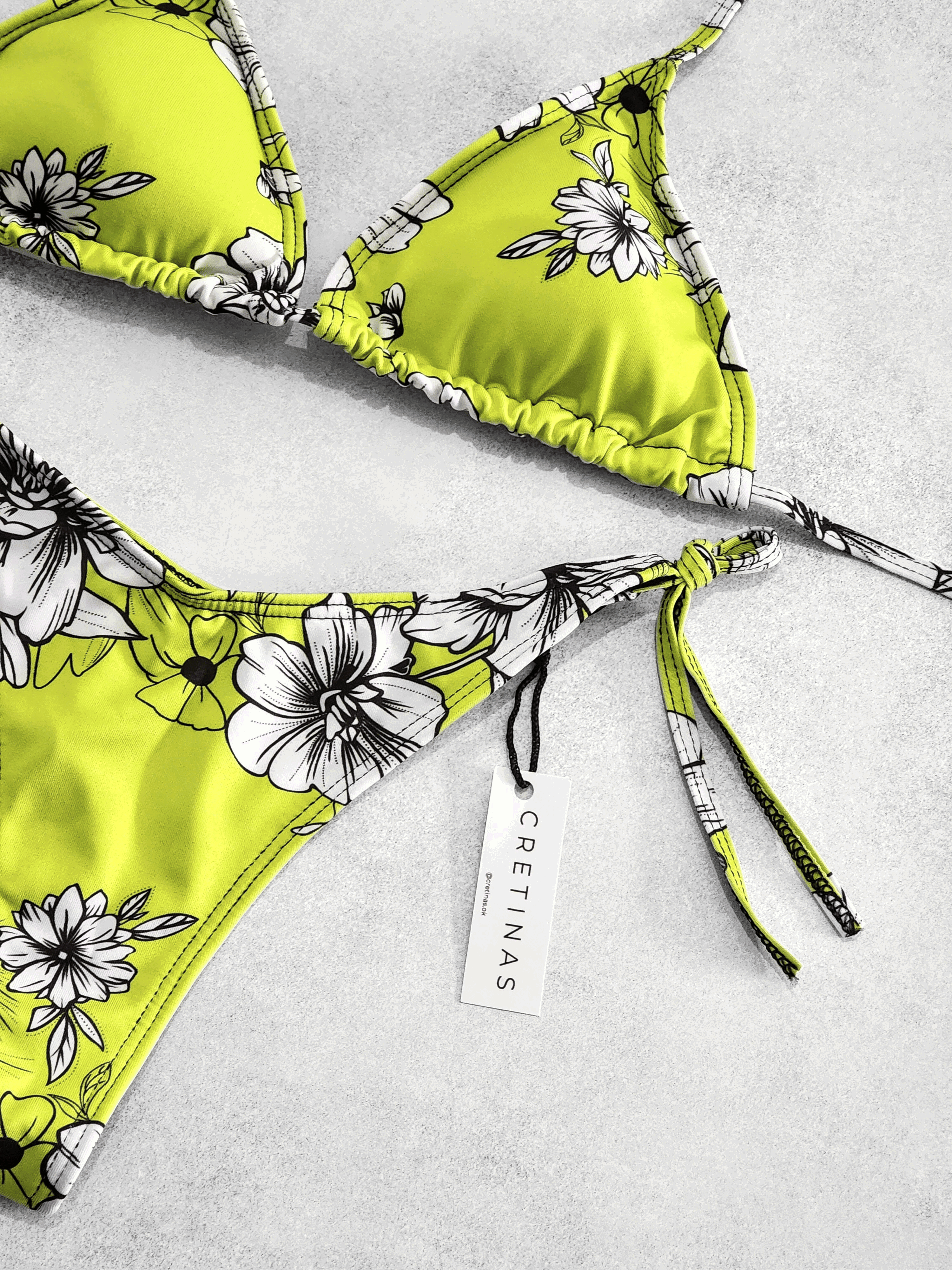 Conjunto estampado. Corpiño triángulo para atar con tazas desmontables. Bombi colaless para atar.