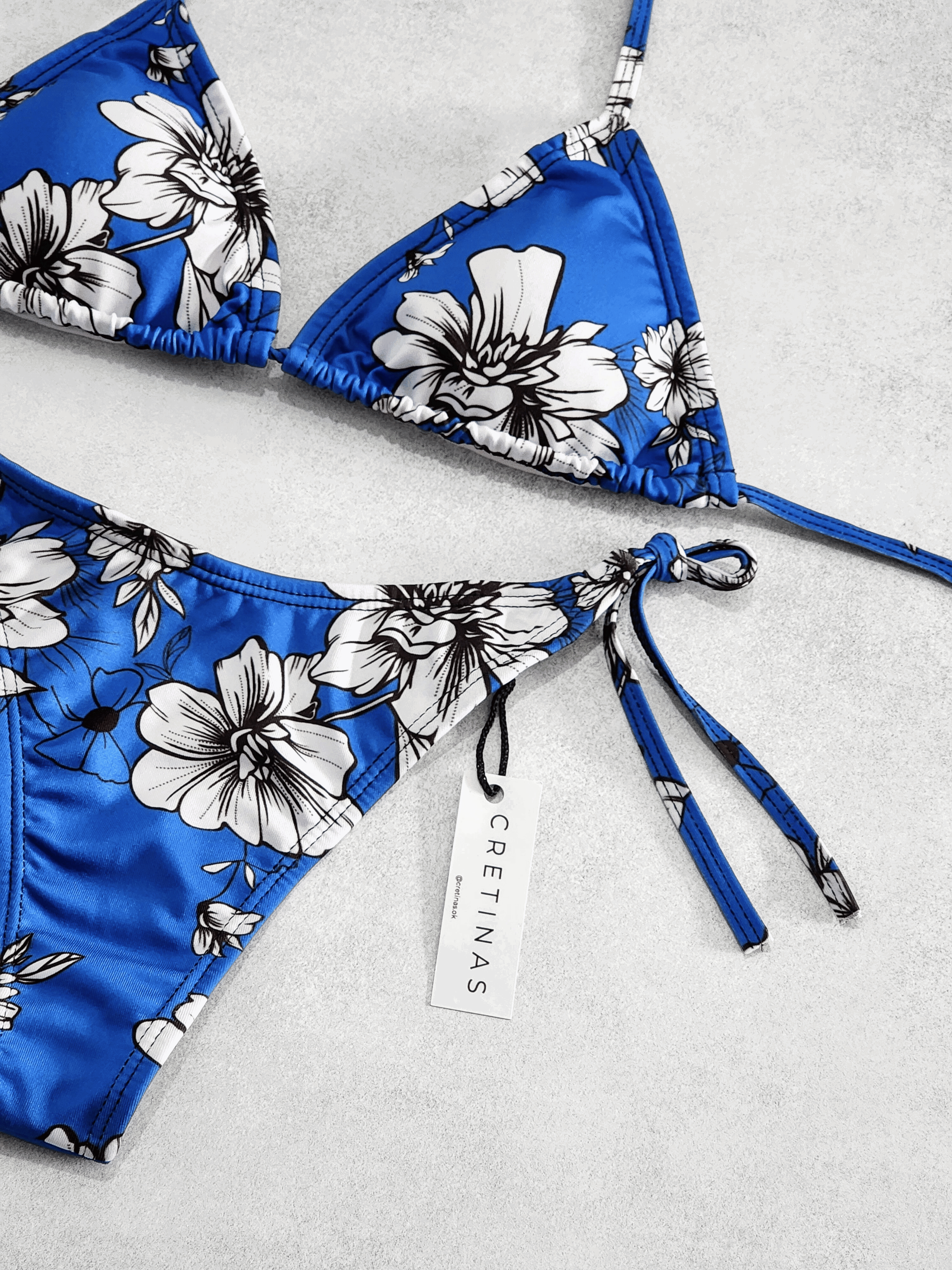 Conjunto estampado. Corpiño triángulo para atar con tazas desmontables. Bombi colaless para atar.