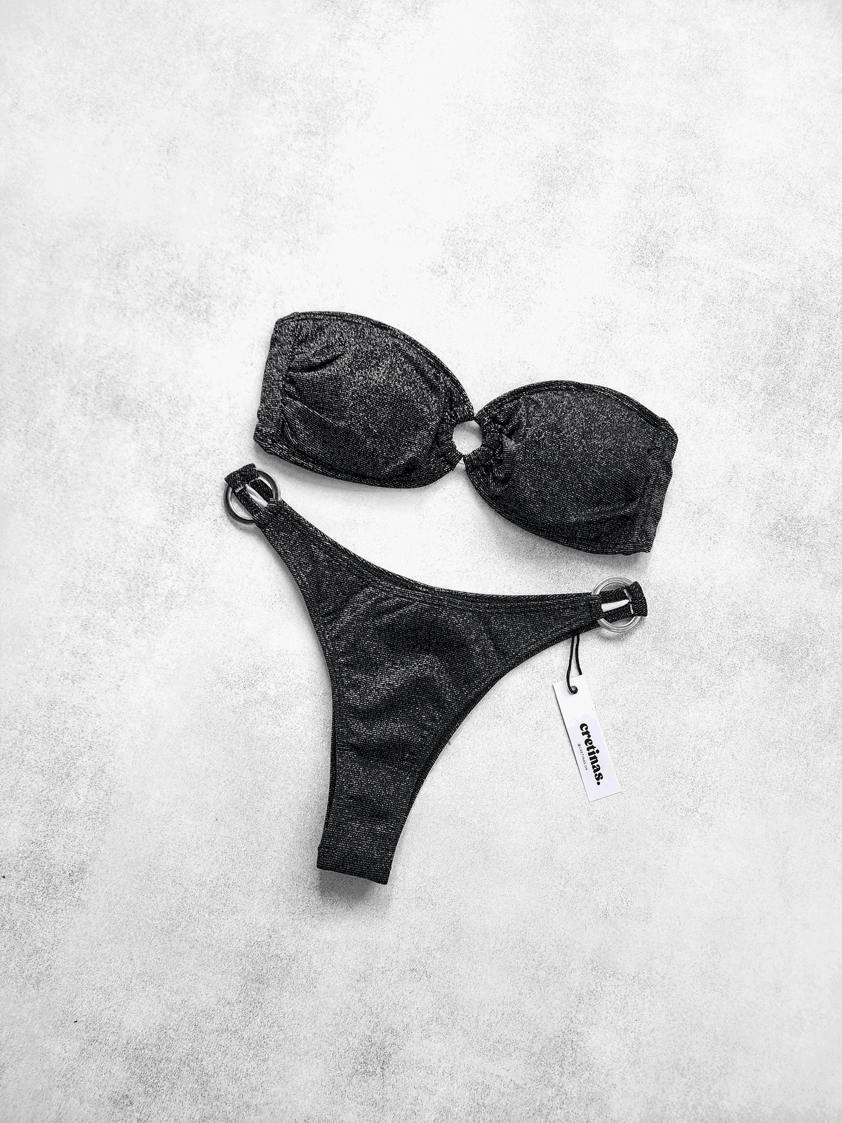 Conjunto estampado tricot lycra con lurex. Corpiño con bretel rodea cuello desmontable, argolla central frunce y tazas desmontables. Bombacha vedetina