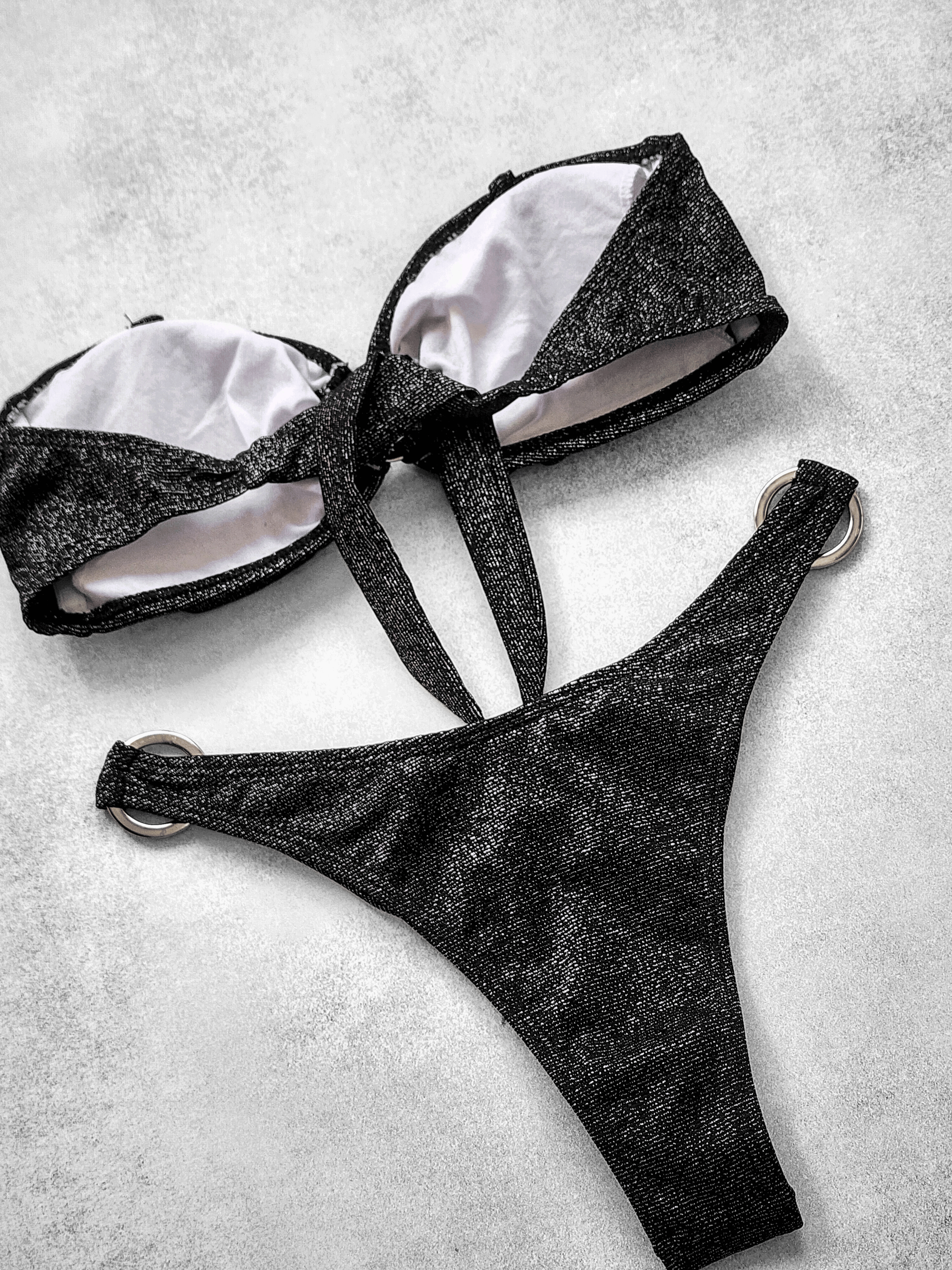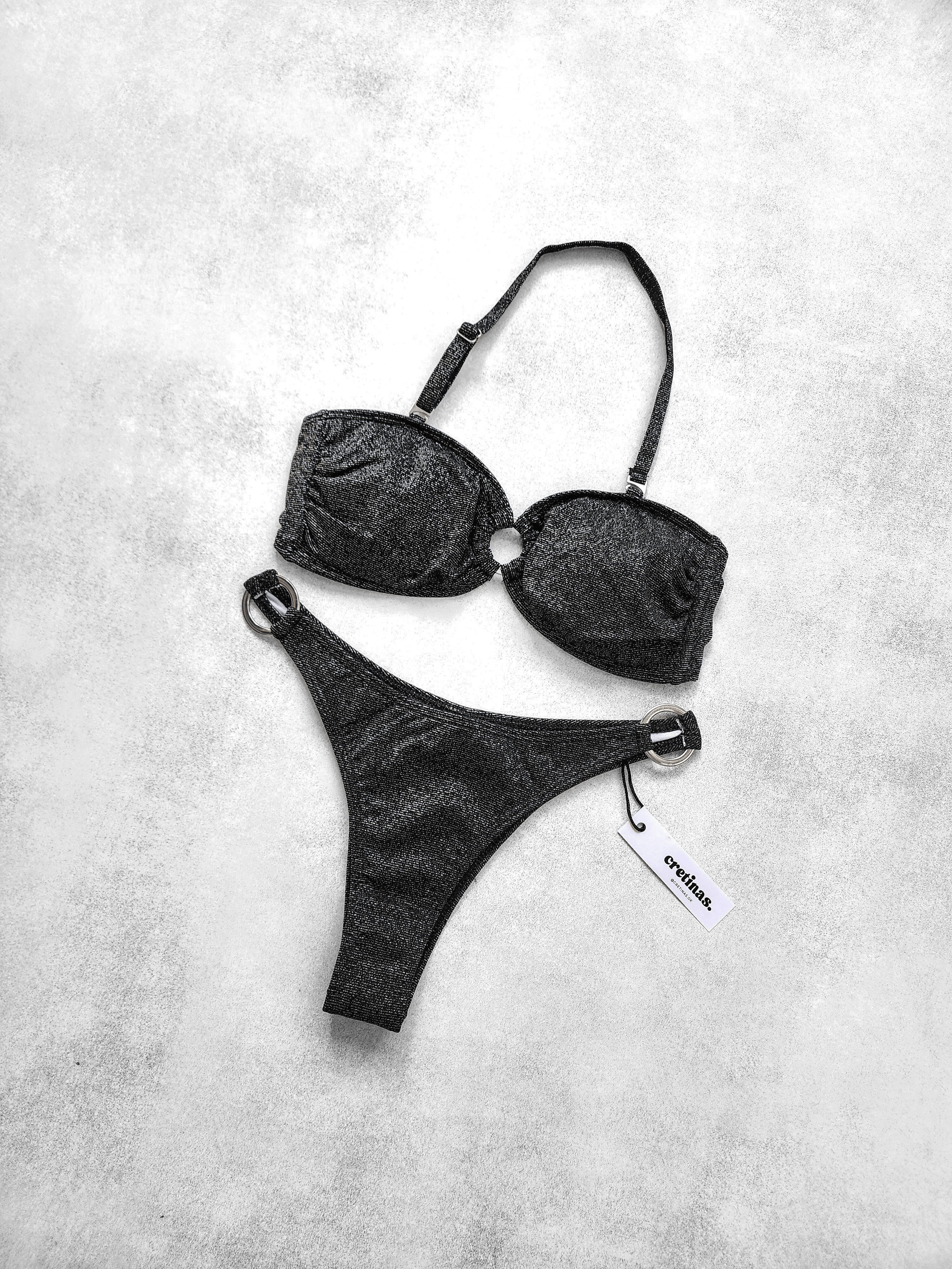 Conjunto estampado tricot lycra con lurex. Corpiño con bretel rodea cuello desmontable, argolla central frunce y tazas desmontables. Bombacha vedetina