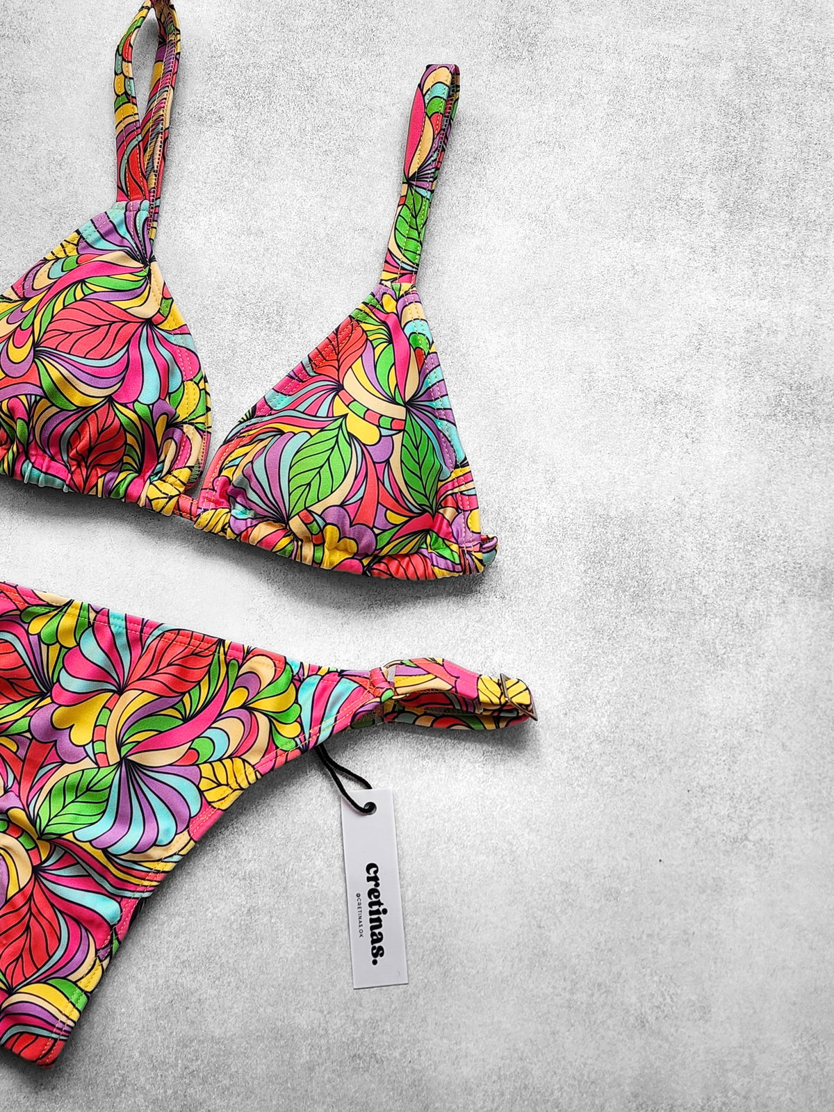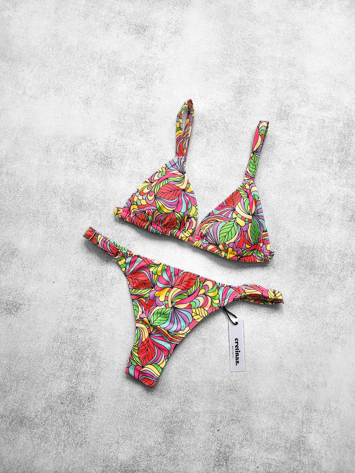 Conjunto estampado tricot. Corpiño triángulo con breteles regulables y tazas desmontables. Bombacha less regulable (breteles anchos)