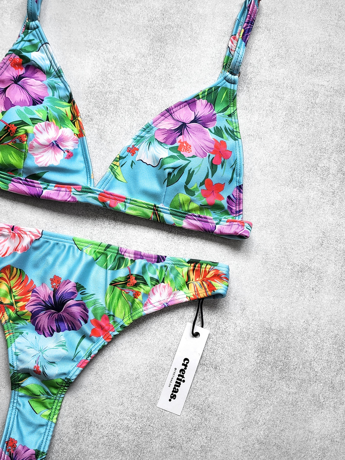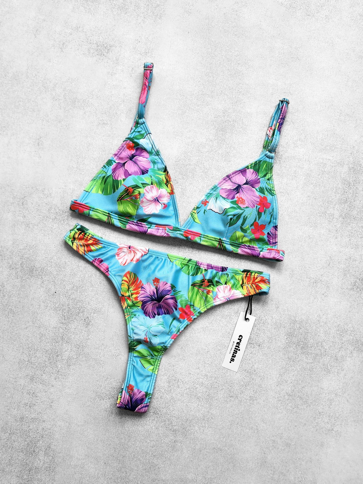 Conjunto estampado tricot lycra totalmente forrada. Corpiño triángulo fijo con breteles regulables y tazas desmontables. Bombacha colaless