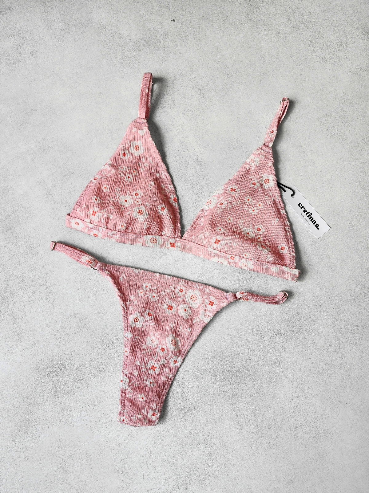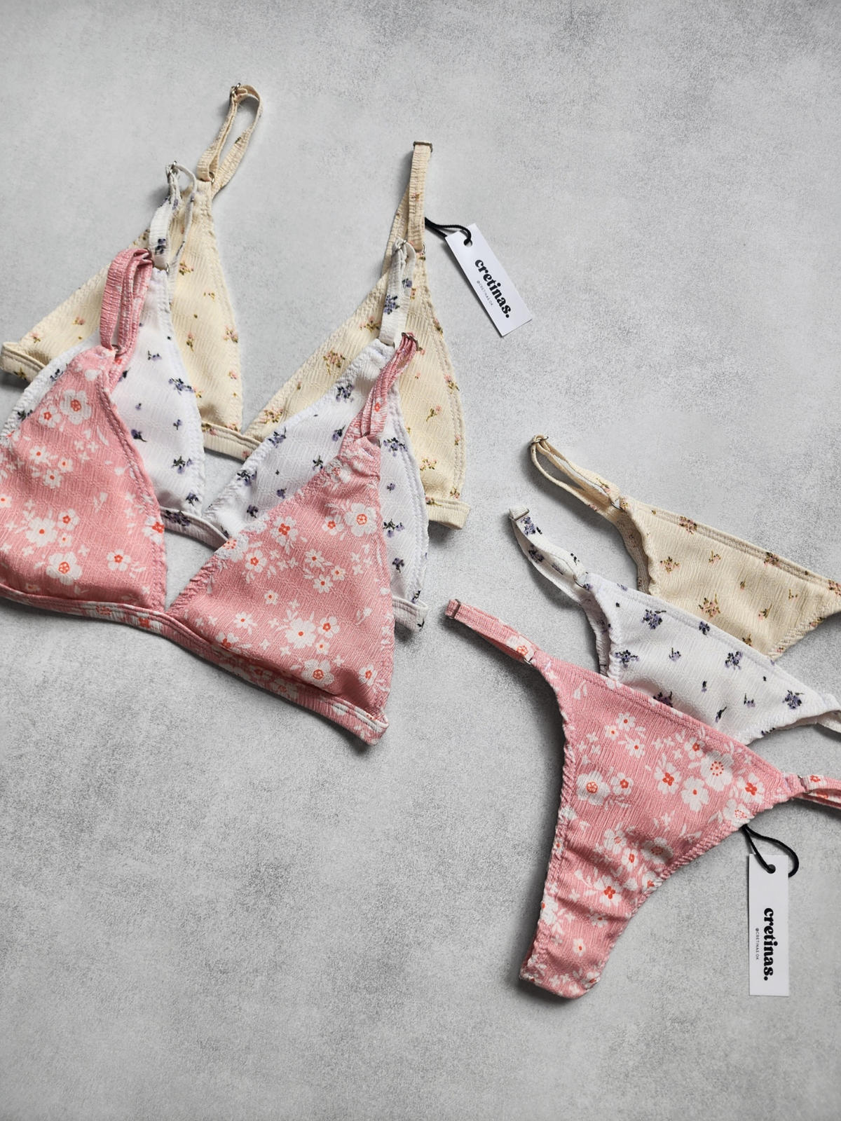 Conjunto estampado. Corpiño triángulo fijo con breteles regulables, tazas desmontables y broche para prender. Bombacha less regulable