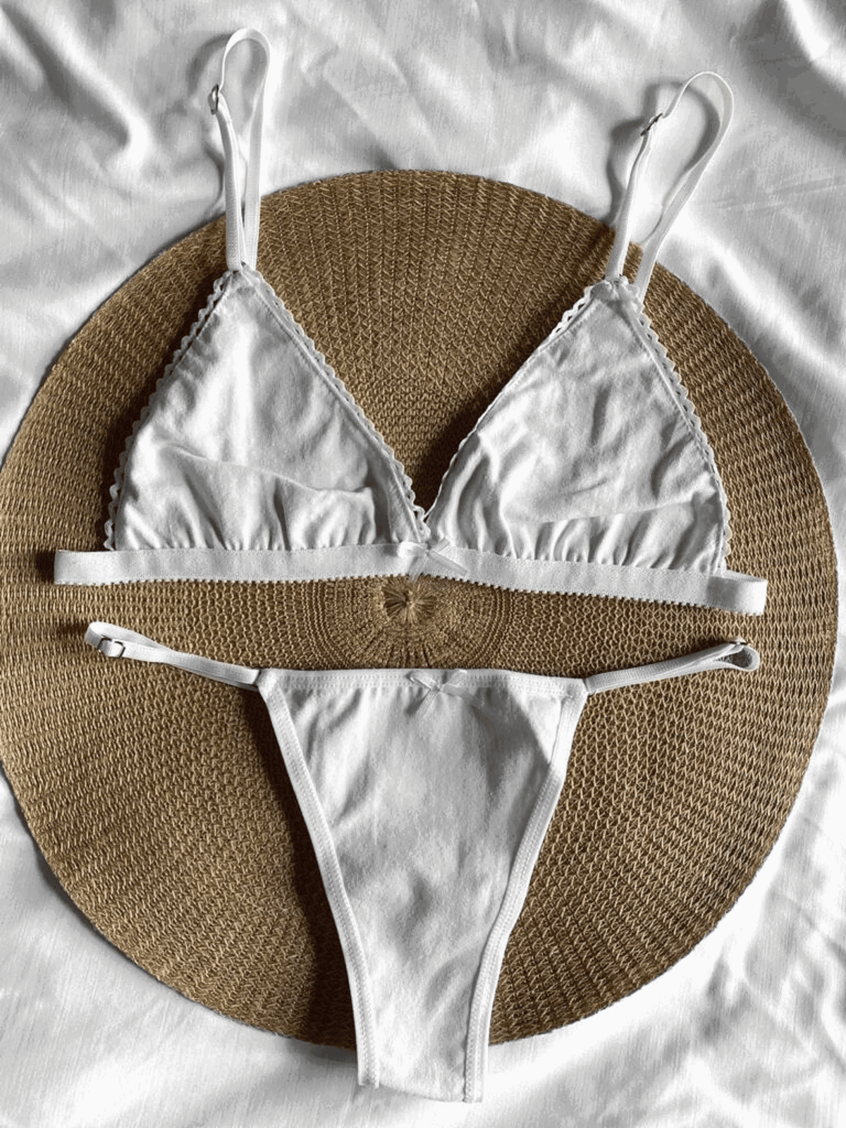 Set de algodón con puntilla. Corpiño sin push con breteles regulables y broche para prender. Less regulable.