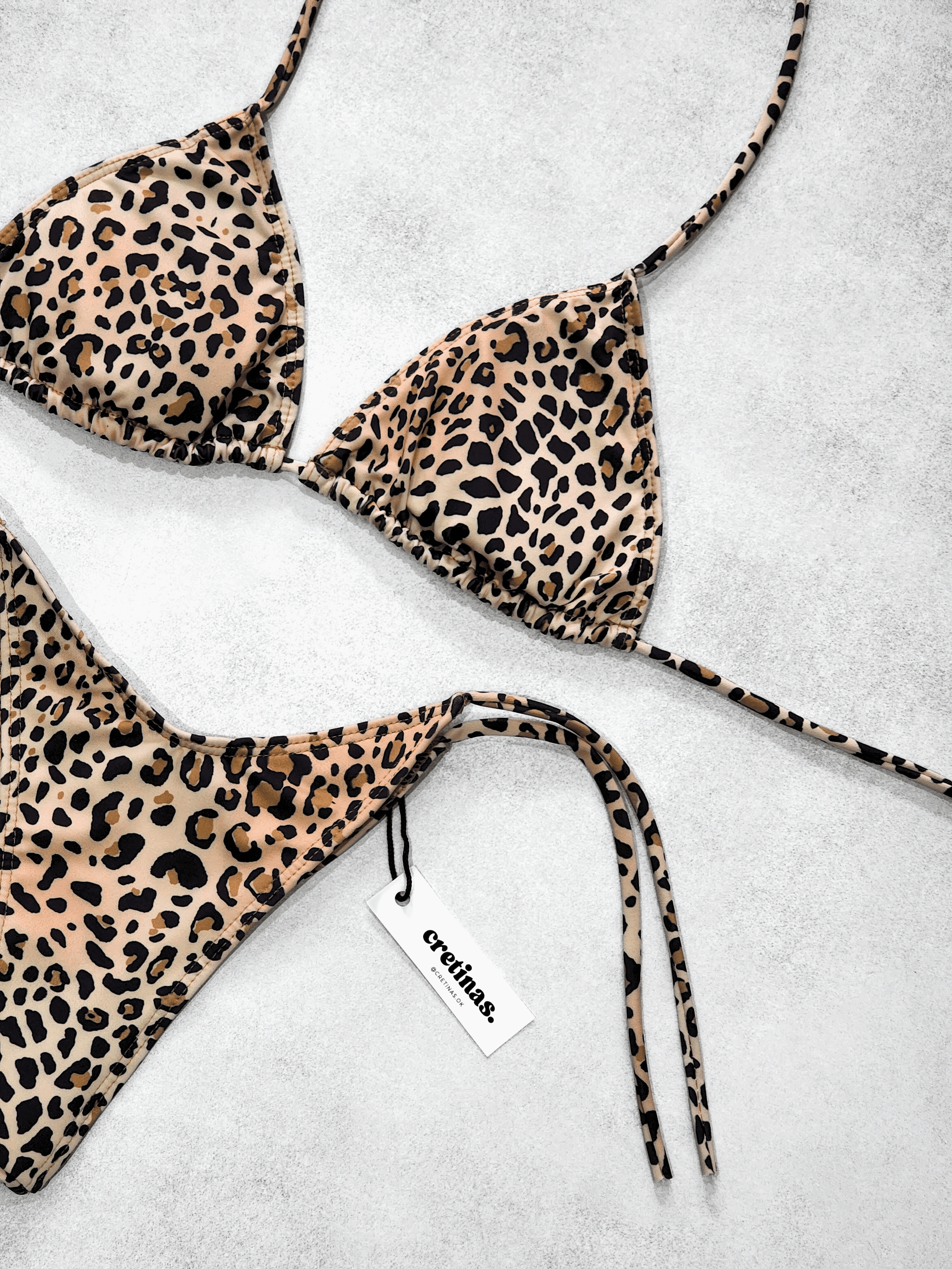 Conjunto estampado, totalmente forrado. Corpiño triángulo para atar con tazas desmontables. Bombacha colaless para atar