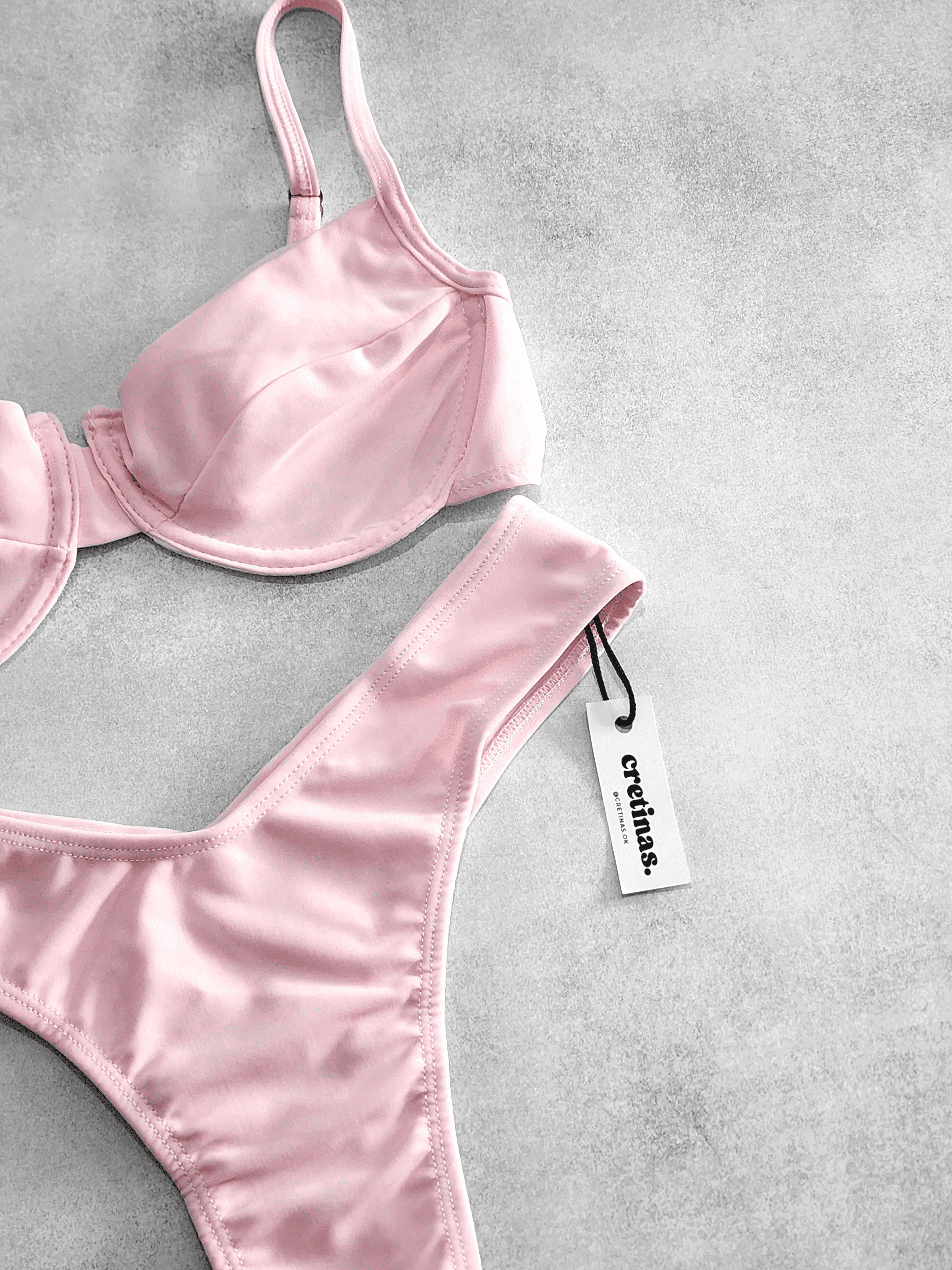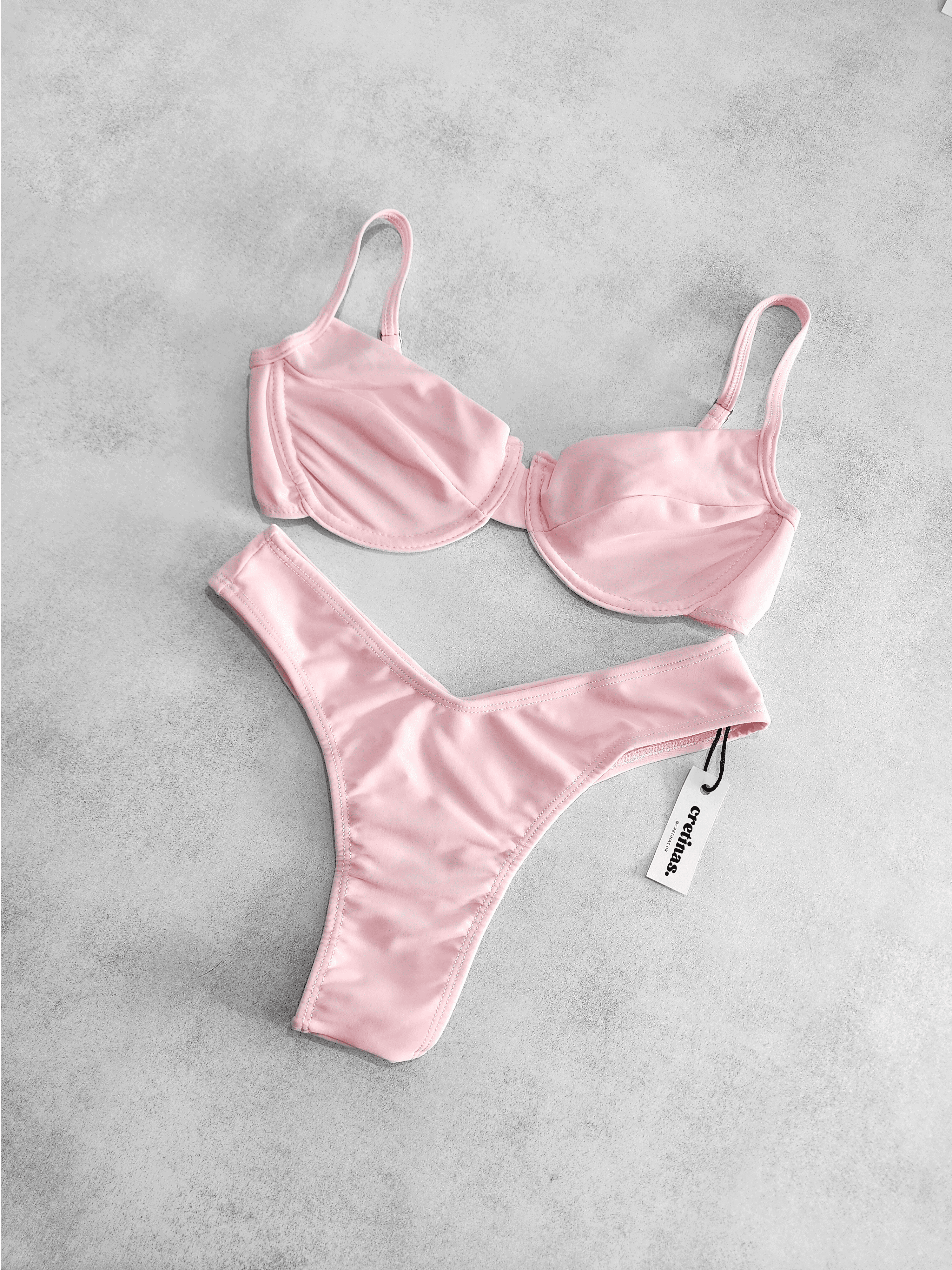 Conjunto lycra. Corpiño para atar, con aro y breteles regulables. Bombacha colaless