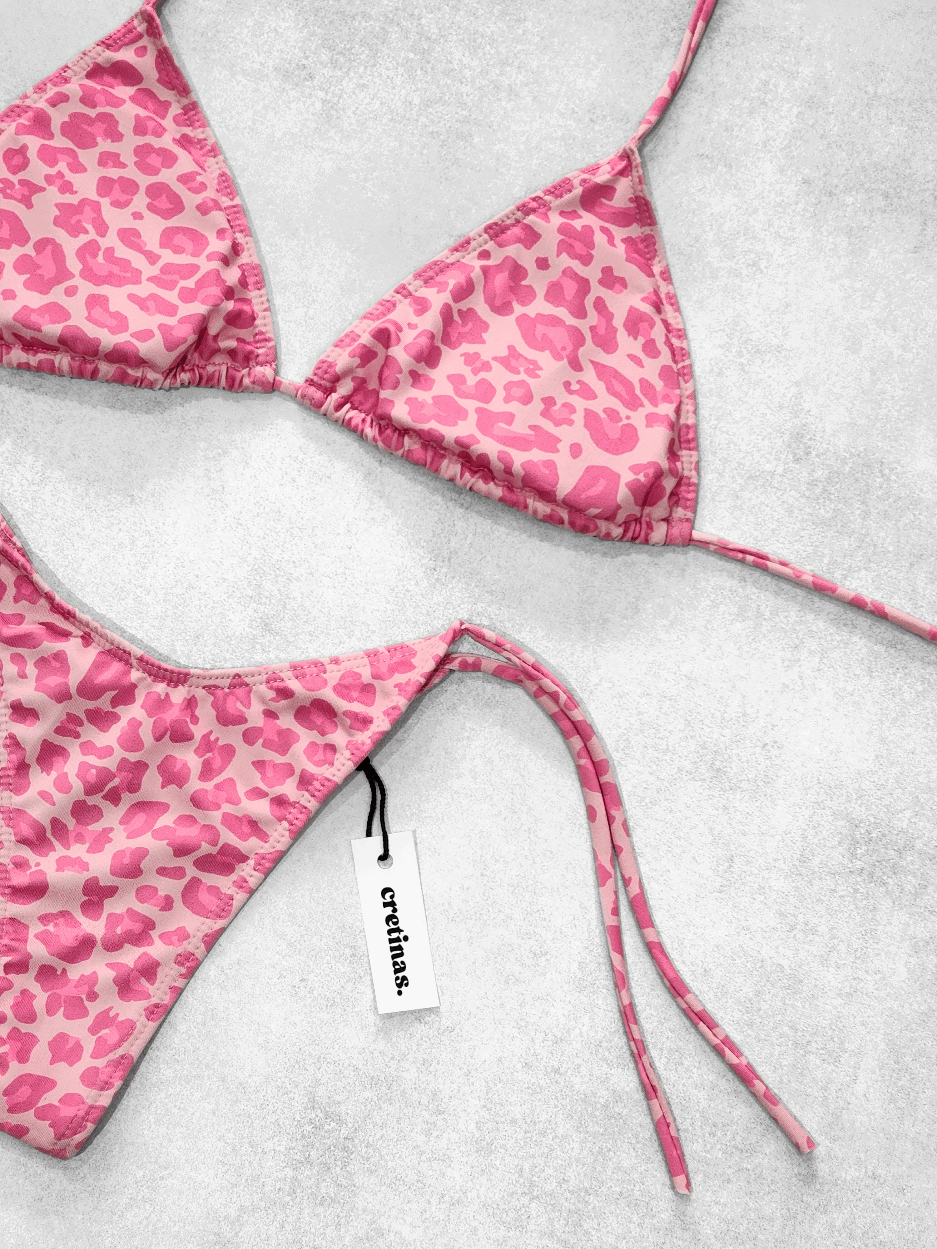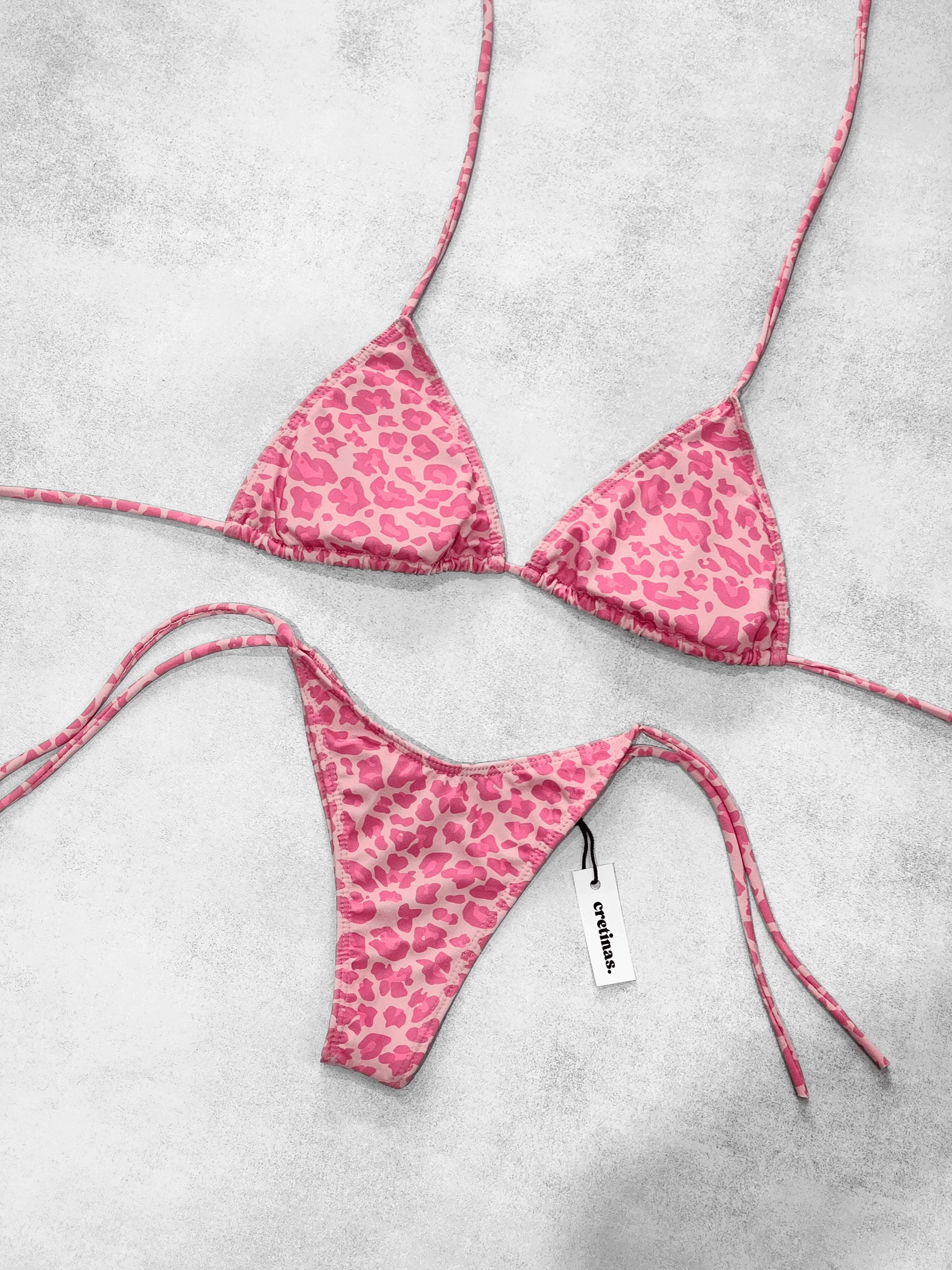 Conjunto estampado, totalmente forrado. Corpiño triángulo para atar con tazas desmontables. Bombacha colaless para atar