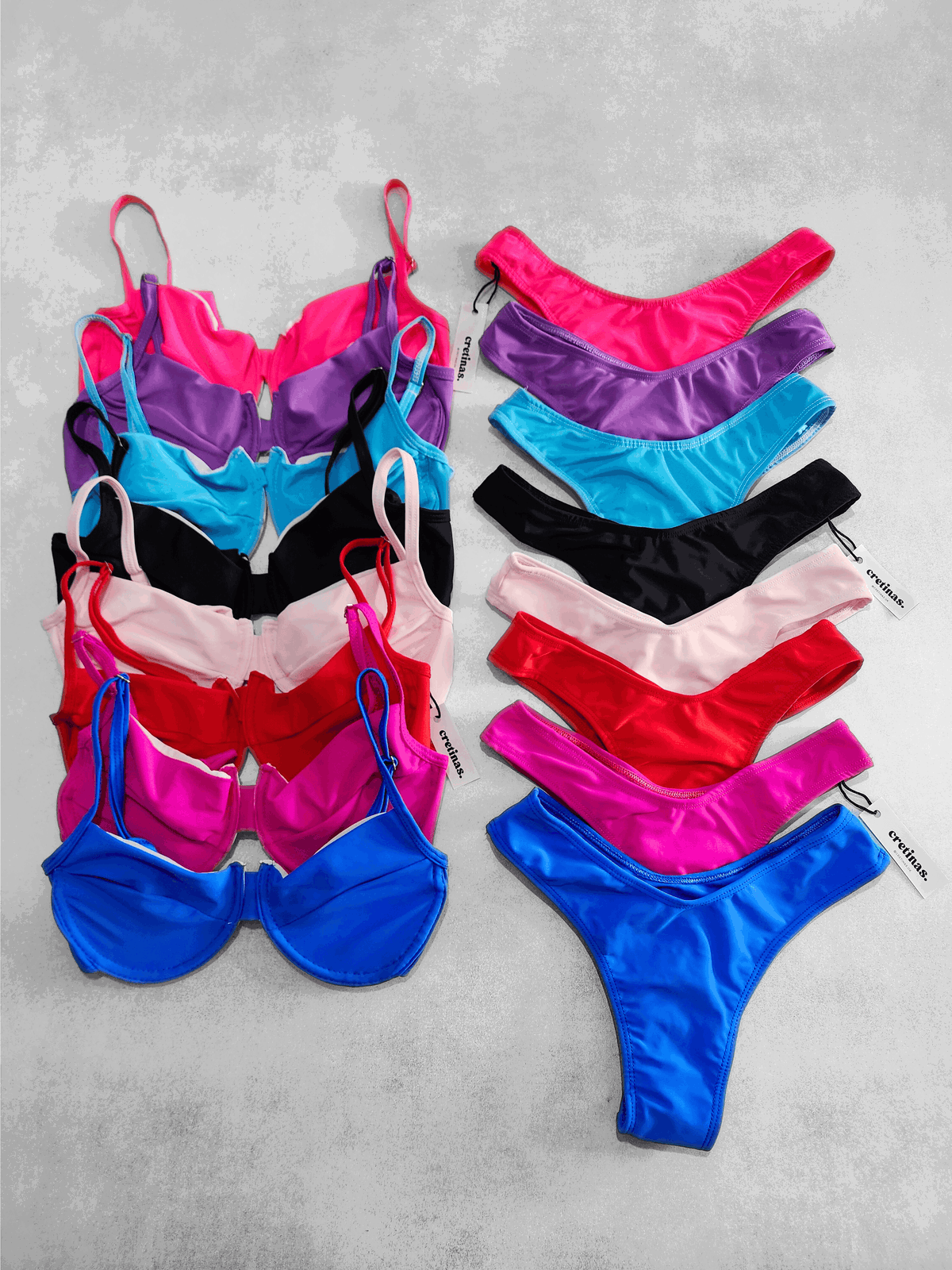 Conjunto lycra. Corpiño para atar, con aro y breteles regulables. Bombacha colaless