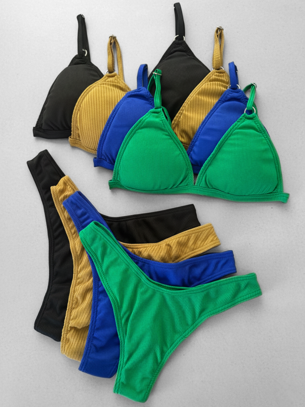 Conjunto lycra morley, completamente forrada. Corpiño triángulo fijo con tazas desmontables y broche en espalda para prender. Bombacha colaless