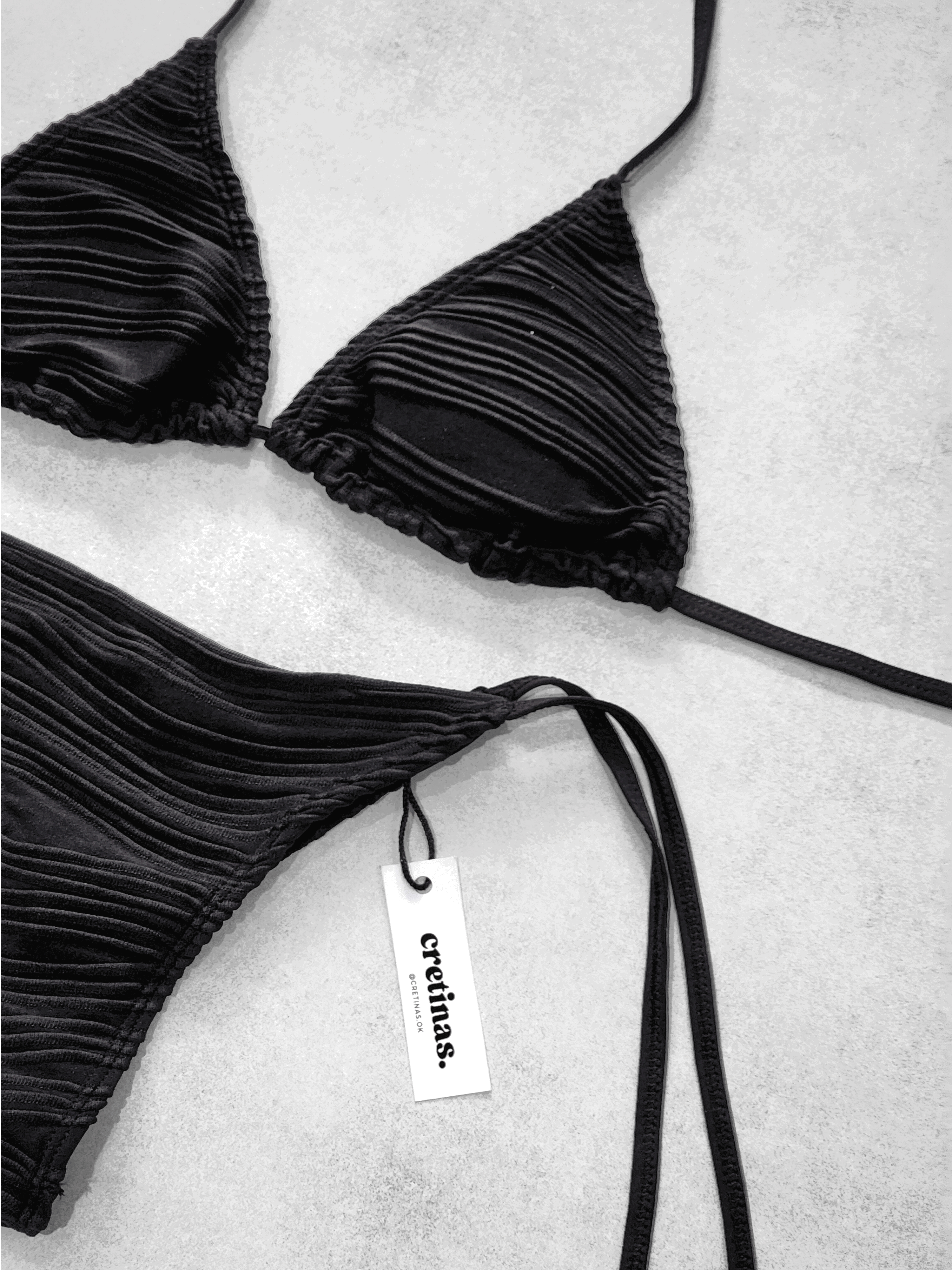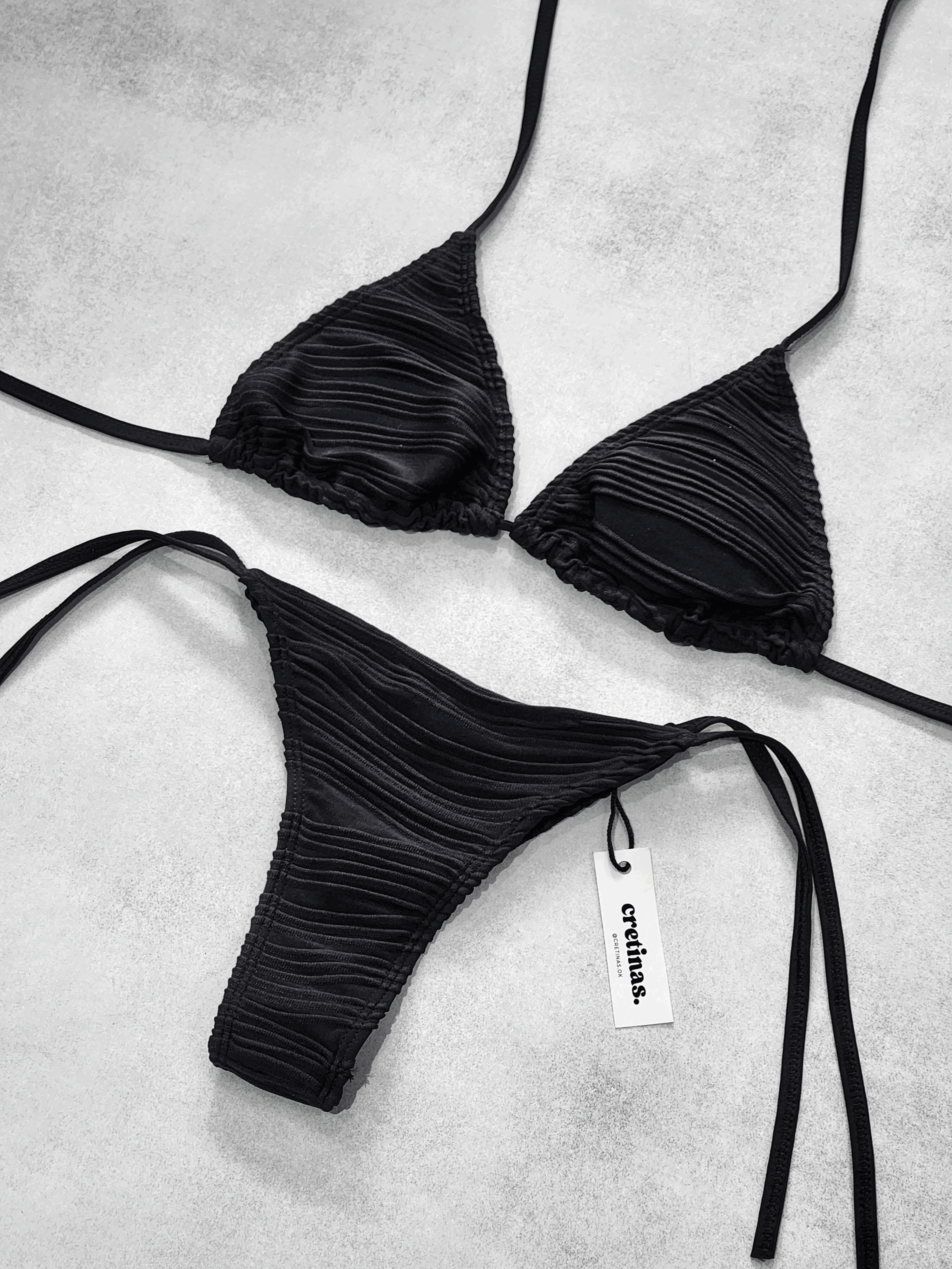 Conjunto relieve. Corpiño triángulo para atar con tazas desmontables. Bombacha colaless para atar