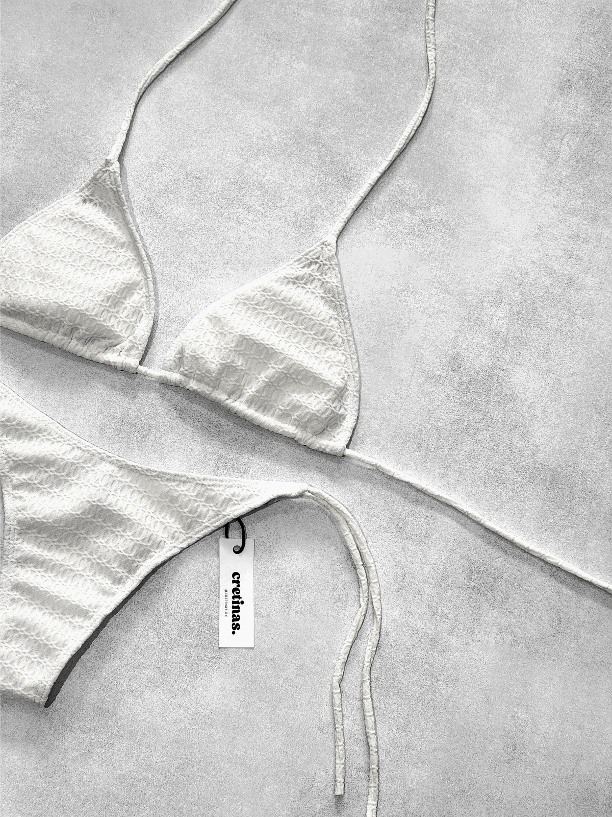 Conjunto texturado. Corpiño triángulo para atar con tazas desmontables. Bombacha colaless para atar