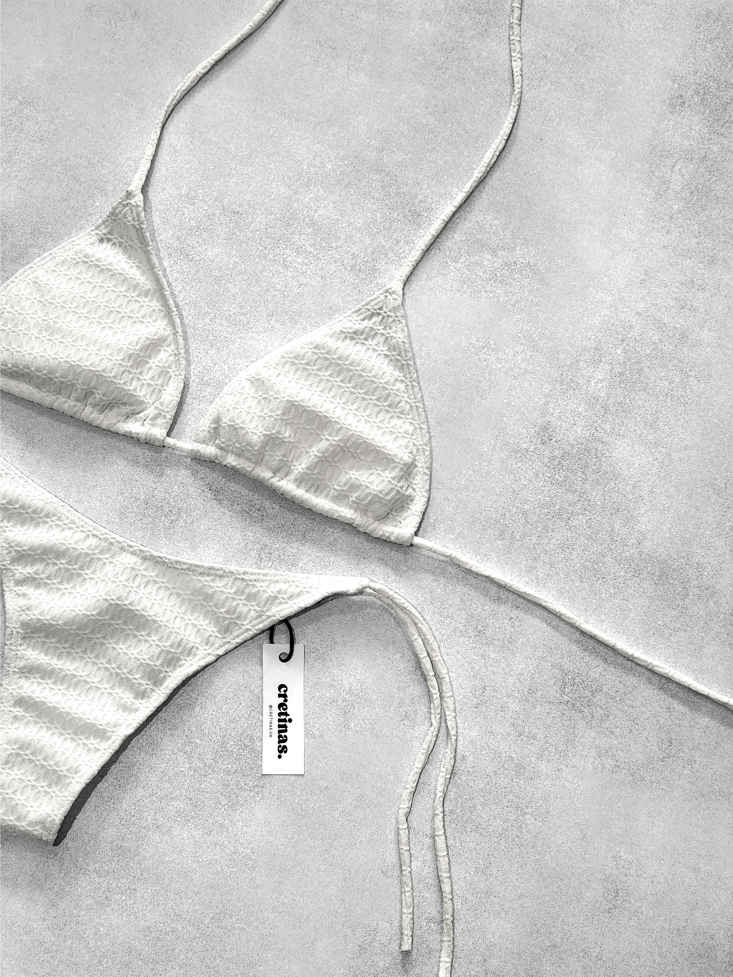 Conjunto texturado. Corpiño triángulo para atar con tazas desmontables. Bombacha colaless para atar