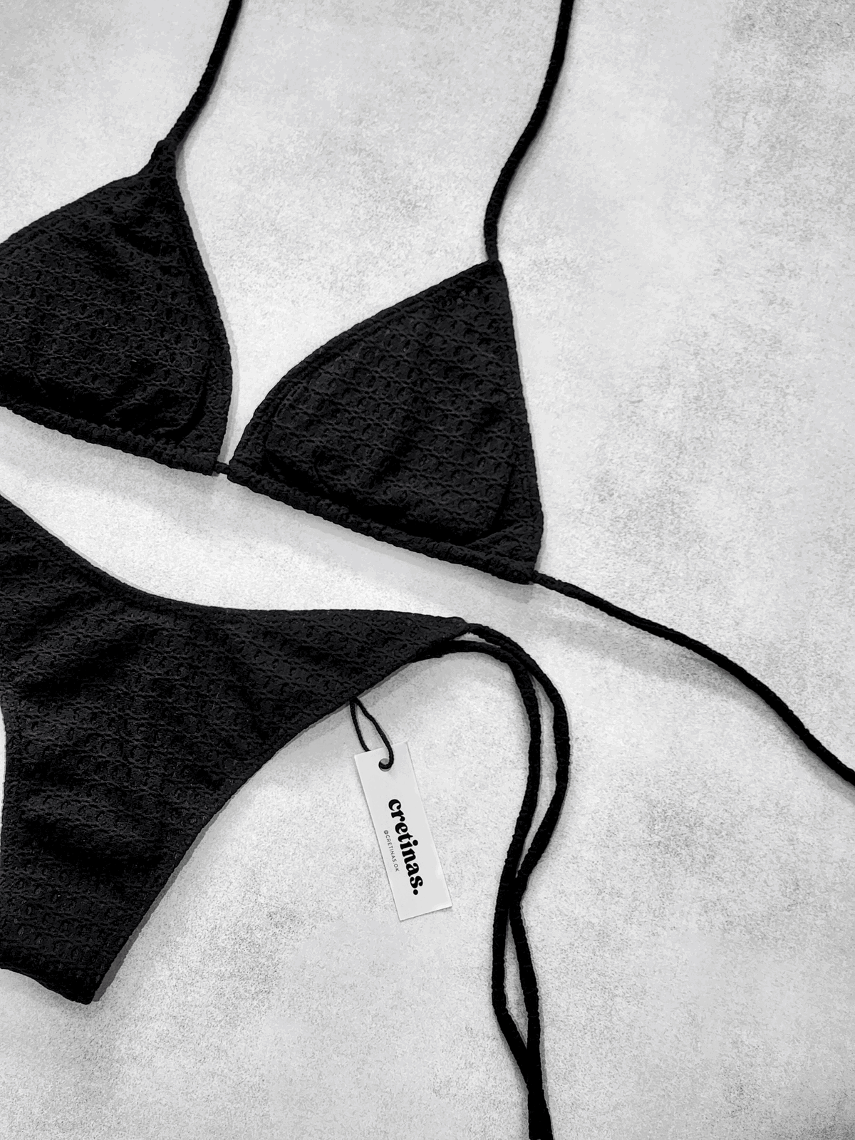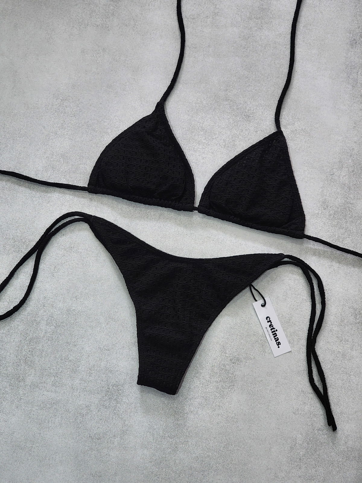 Conjunto texturado. Corpiño triángulo para atar con tazas desmontables. Bombacha colaless para atar