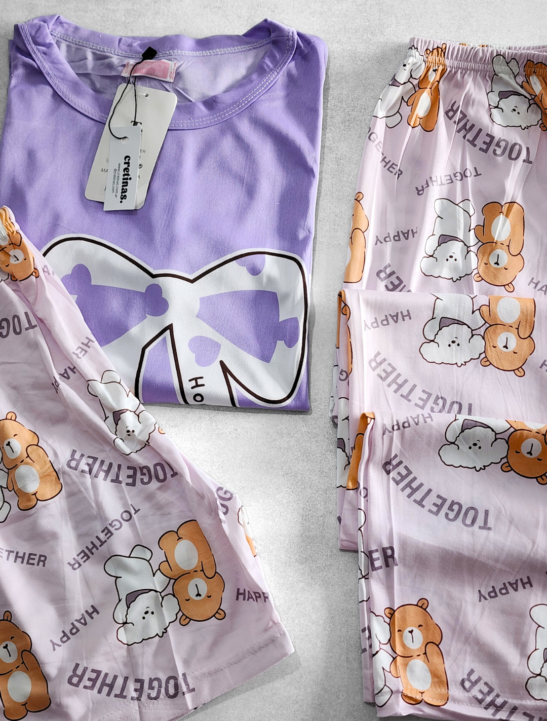 Pijama importado 3 piezas: remera manga corta, short con cintura elastizada y pantalón largo con cintura elastizada.