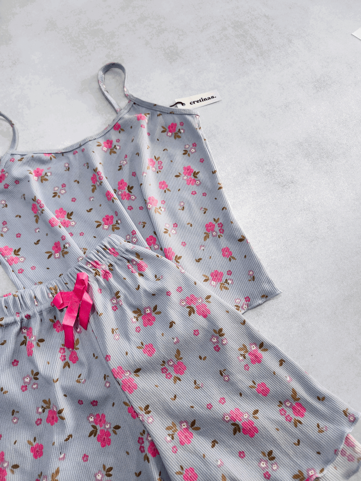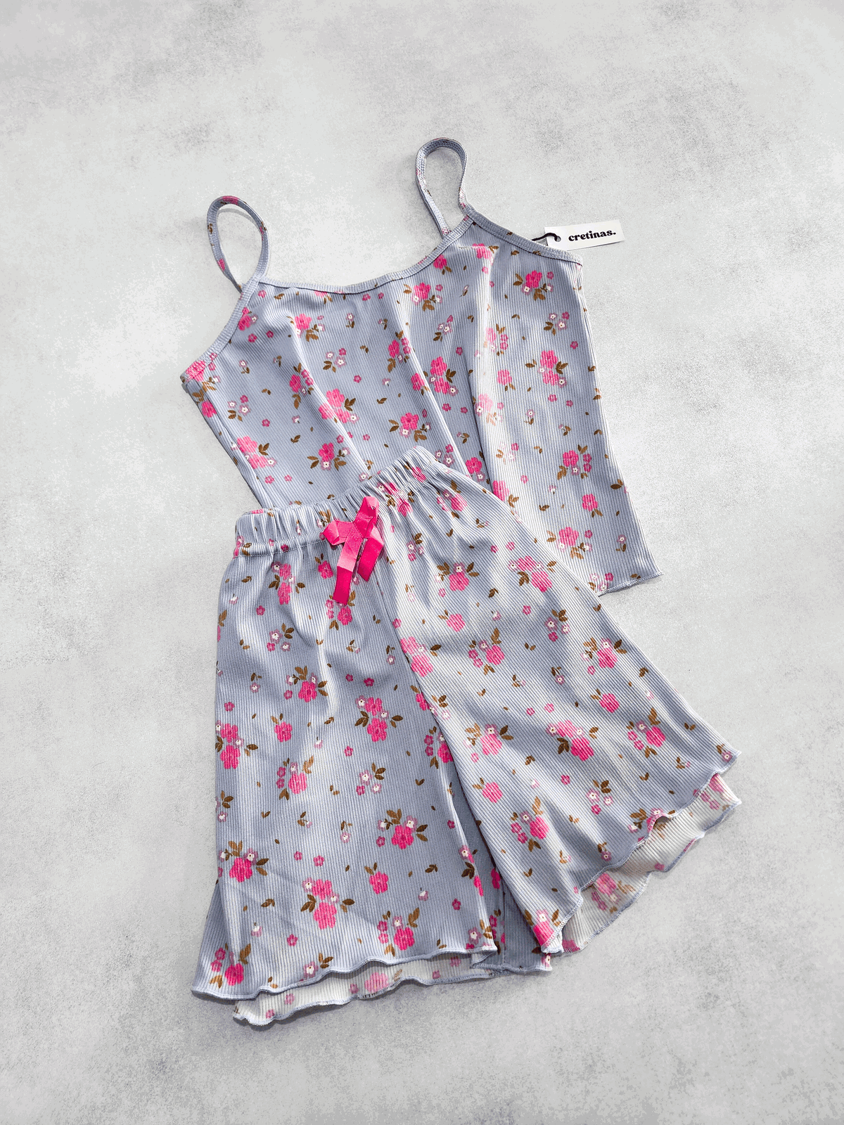 Tela morley. Remera musculosa con tiritas. Short con elástico y moño decorativo.