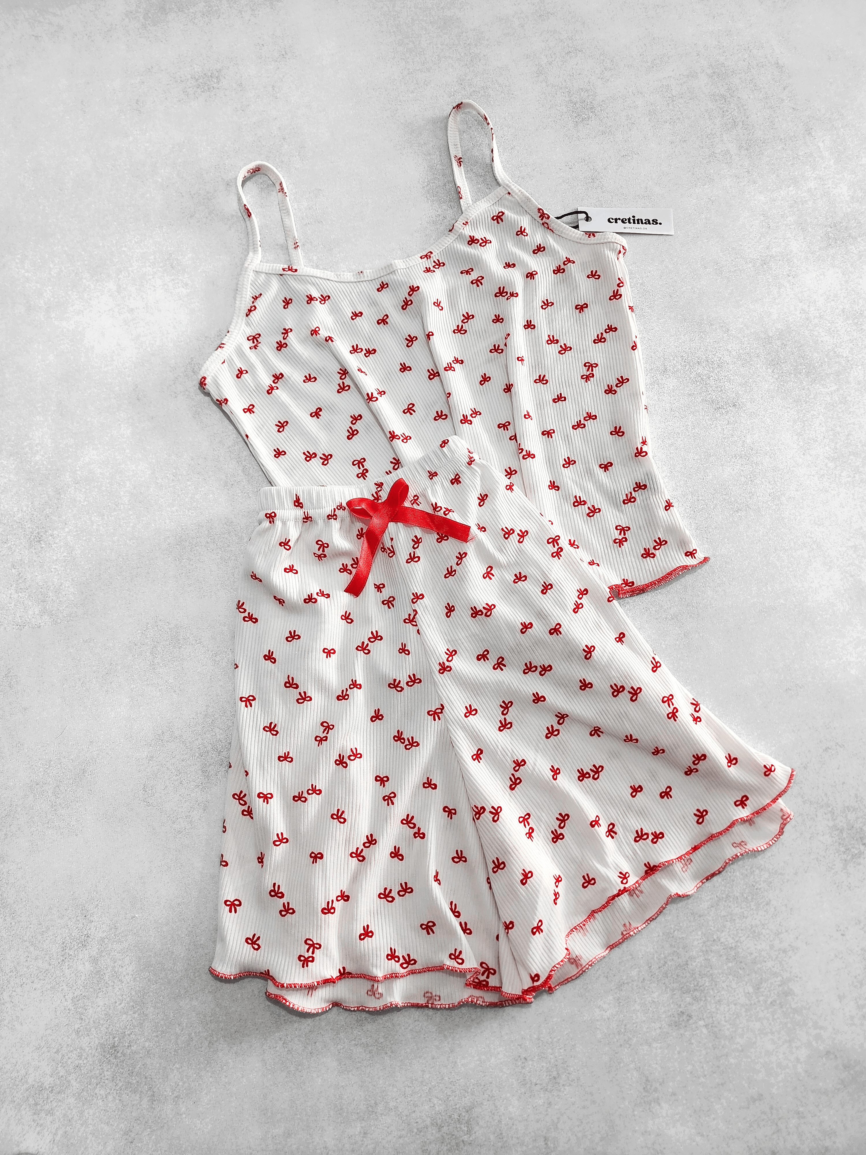 Tela morley. Remera musculosa con tiritas. Short con elástico y moño decorativo.