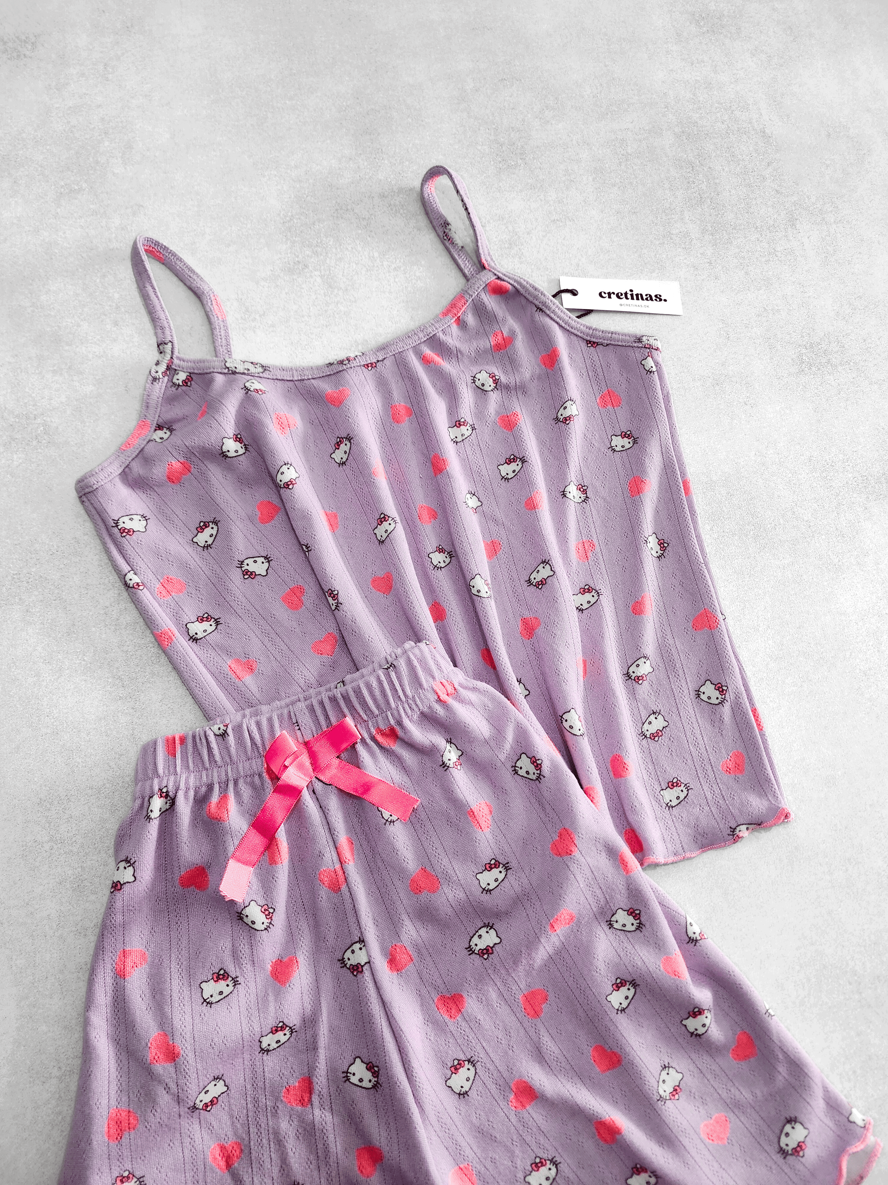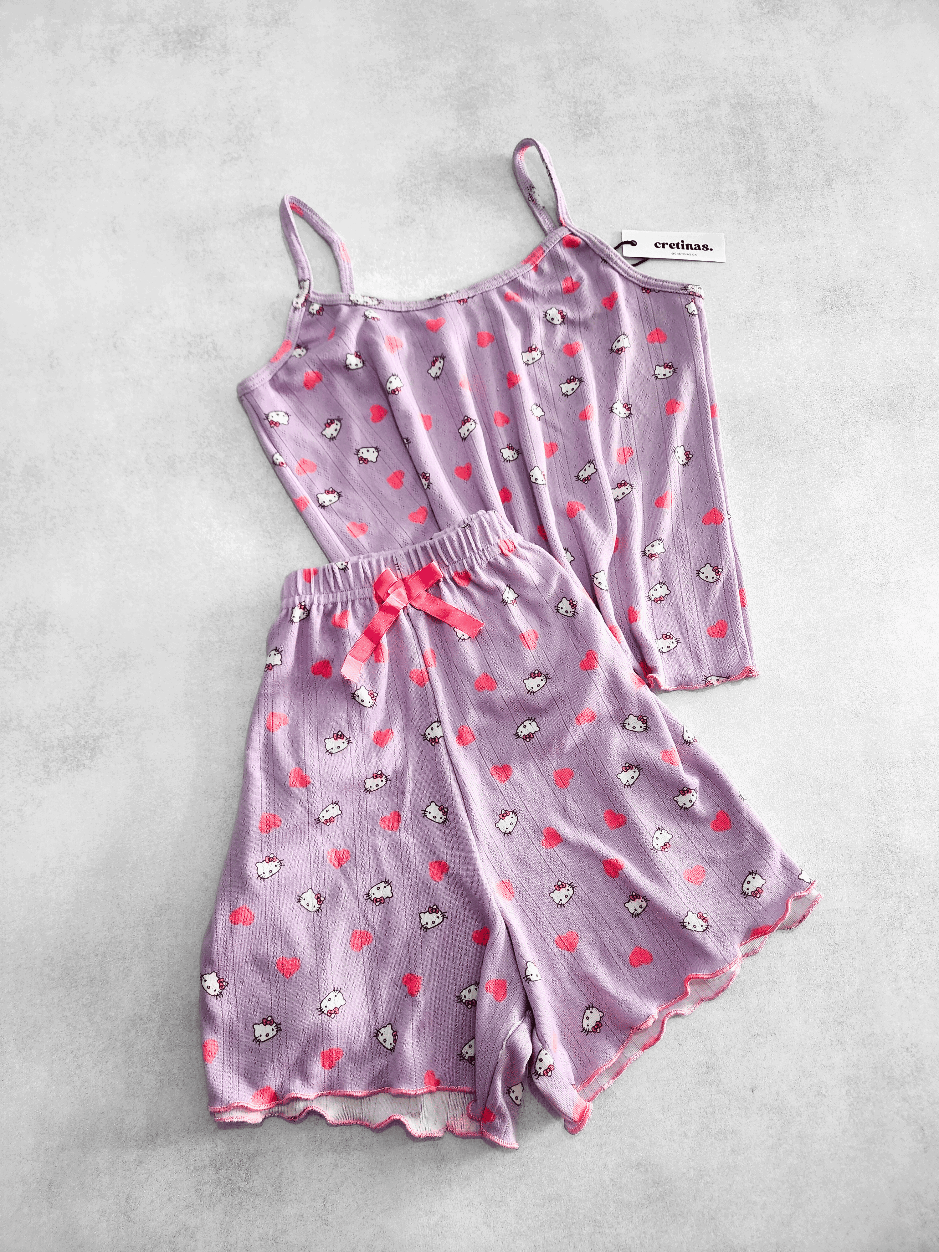 Tela con diseño. Remera musculosa con tiritas. Short con elástico y moño decorativo.