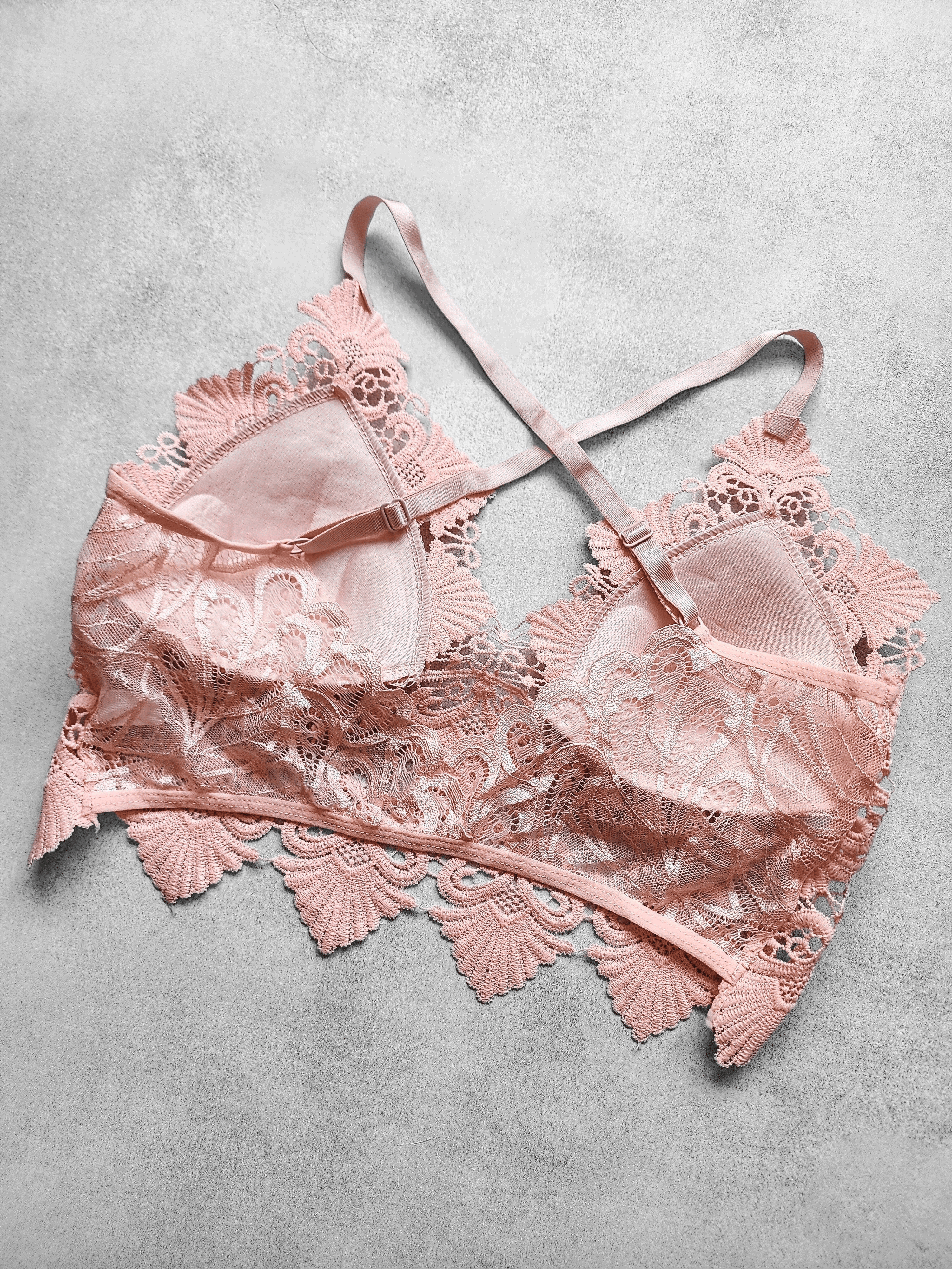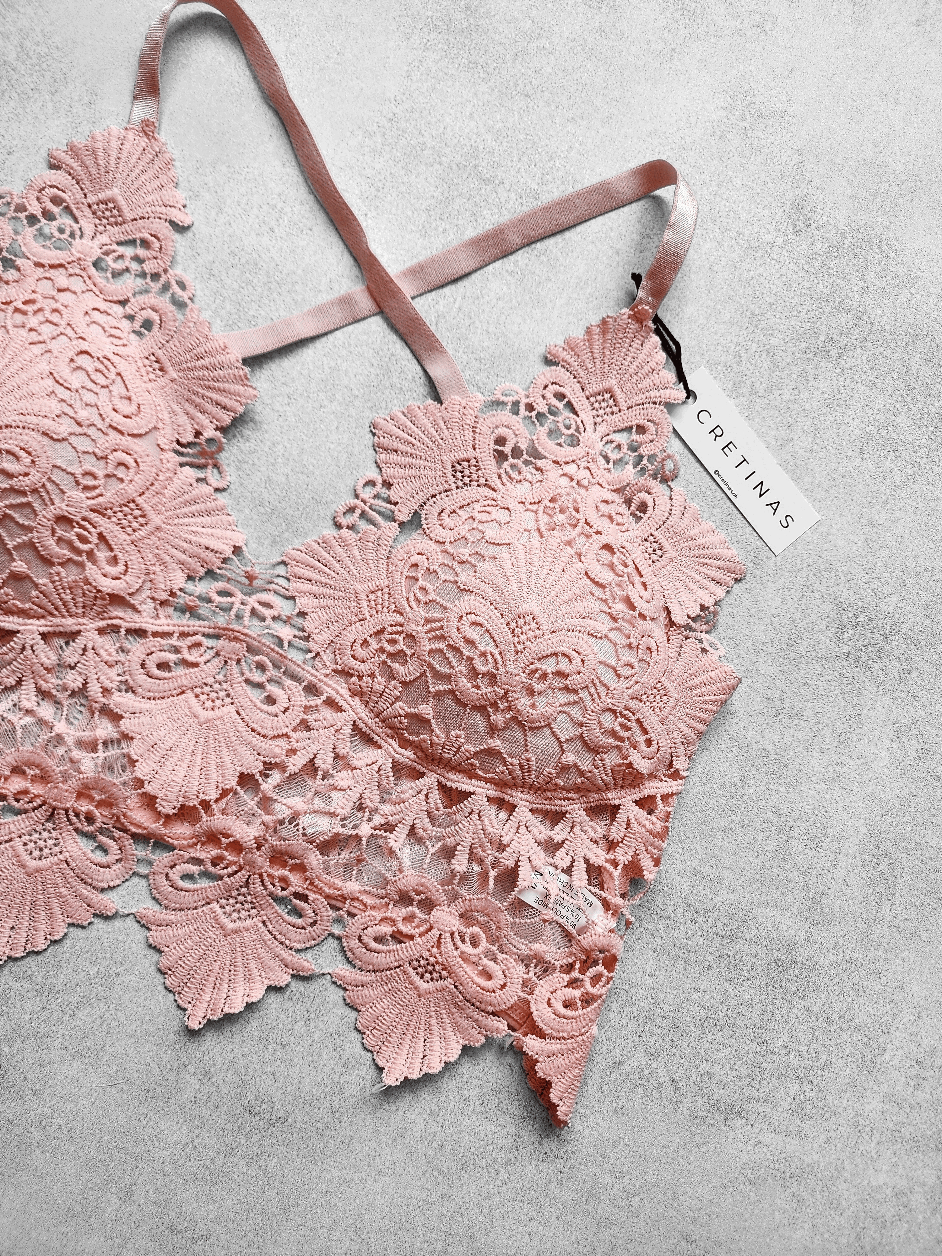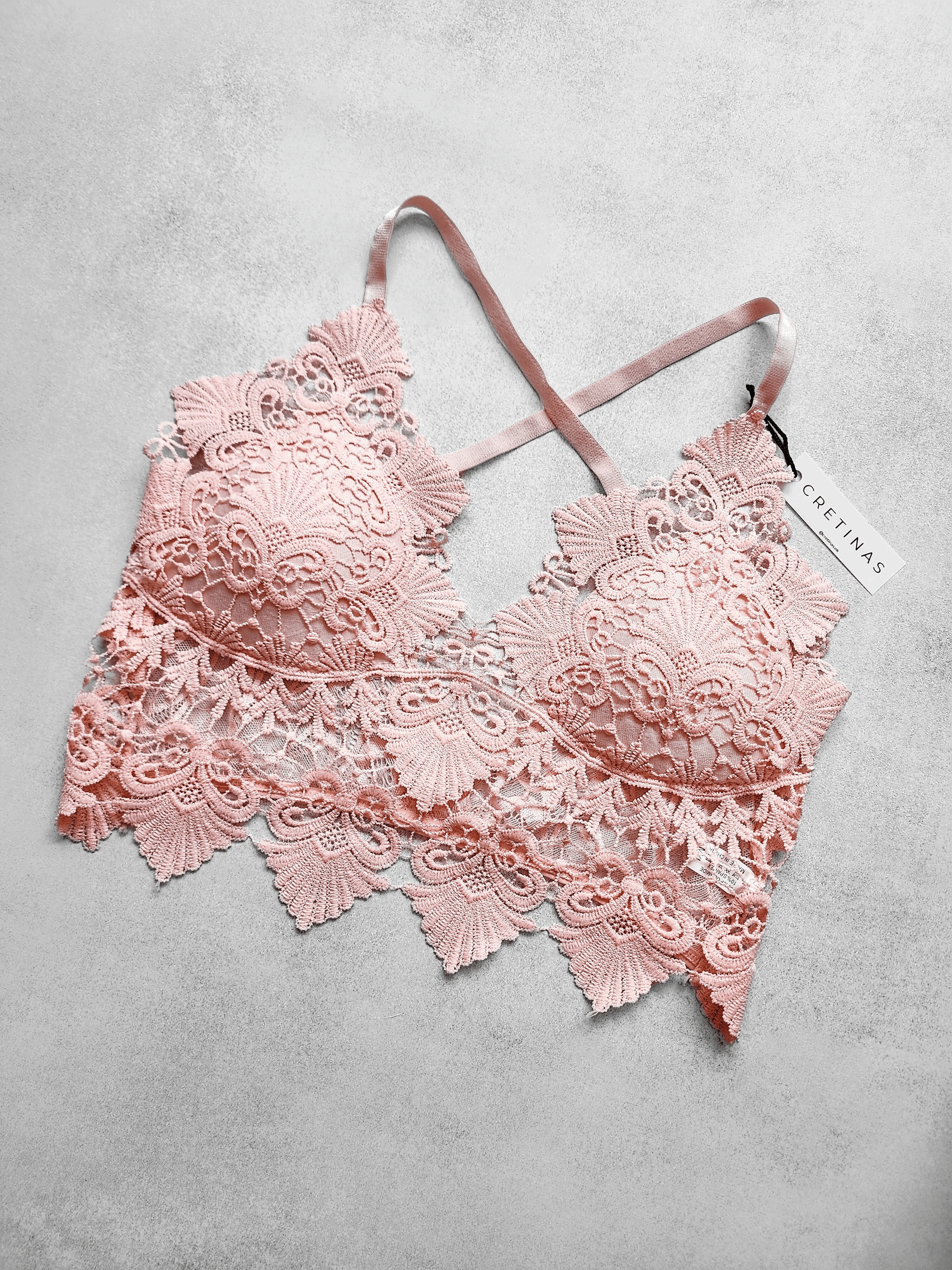 Bordado con tazas fijas y breteles regulables. Espalda cruzada con detalle en encaje.