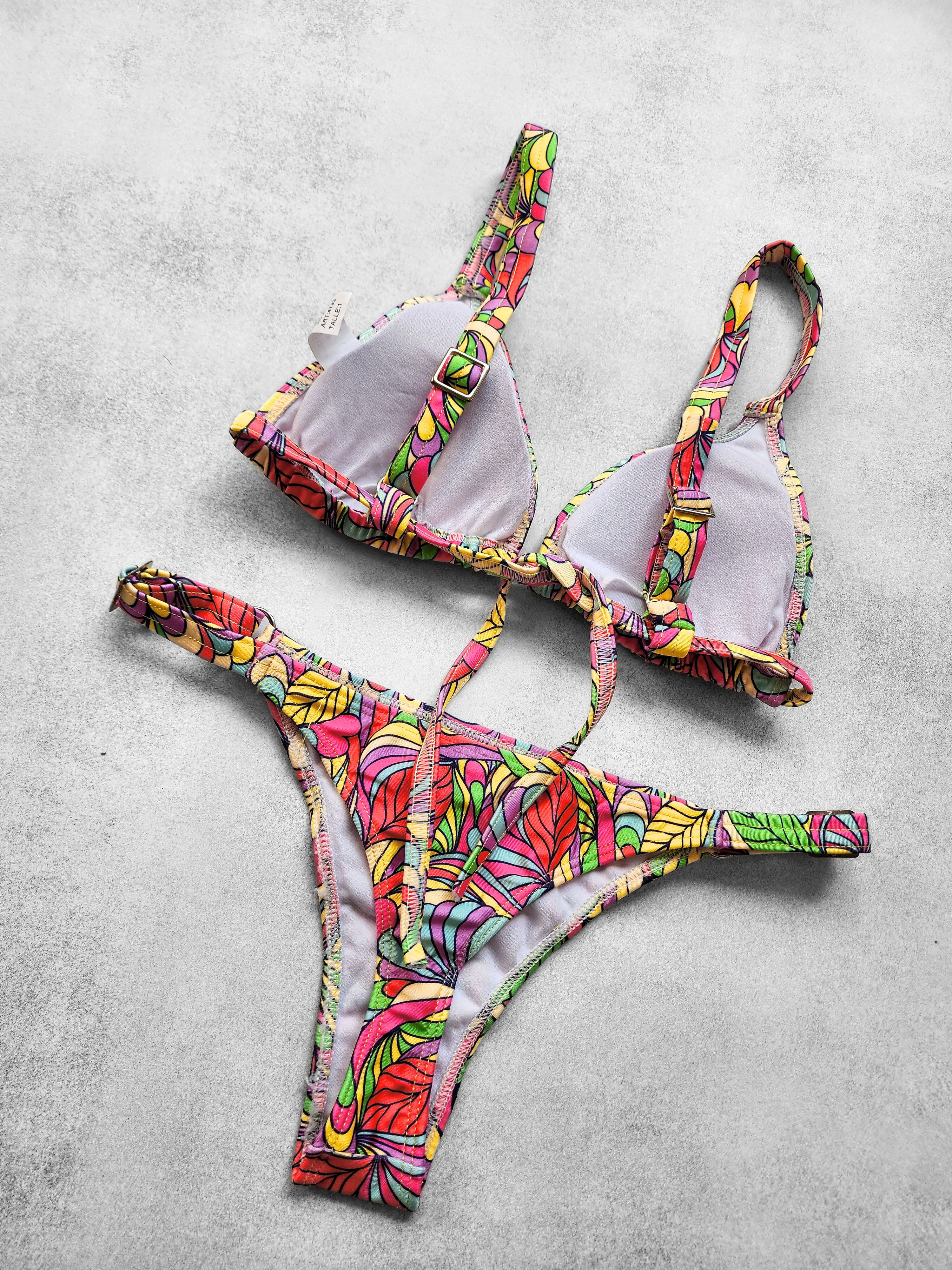 Conjunto estampado tricot. Corpiño triángulo con breteles regulables y tazas desmontables. Bombacha less regulable (breteles anchos)
