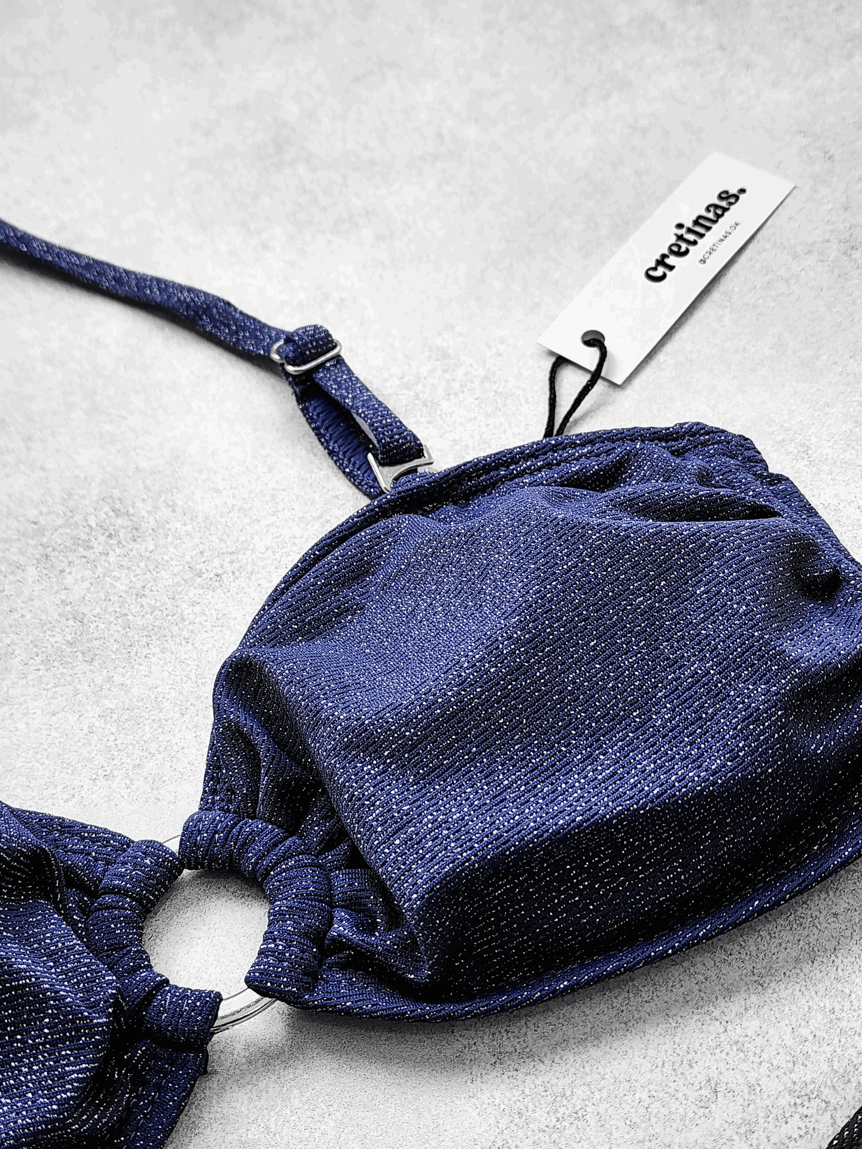 Conjunto estampado tricot lycra con lurex. Corpiño con bretel rodea cuello desmontable, argolla central frunce y tazas desmontables. Bombacha vedetina