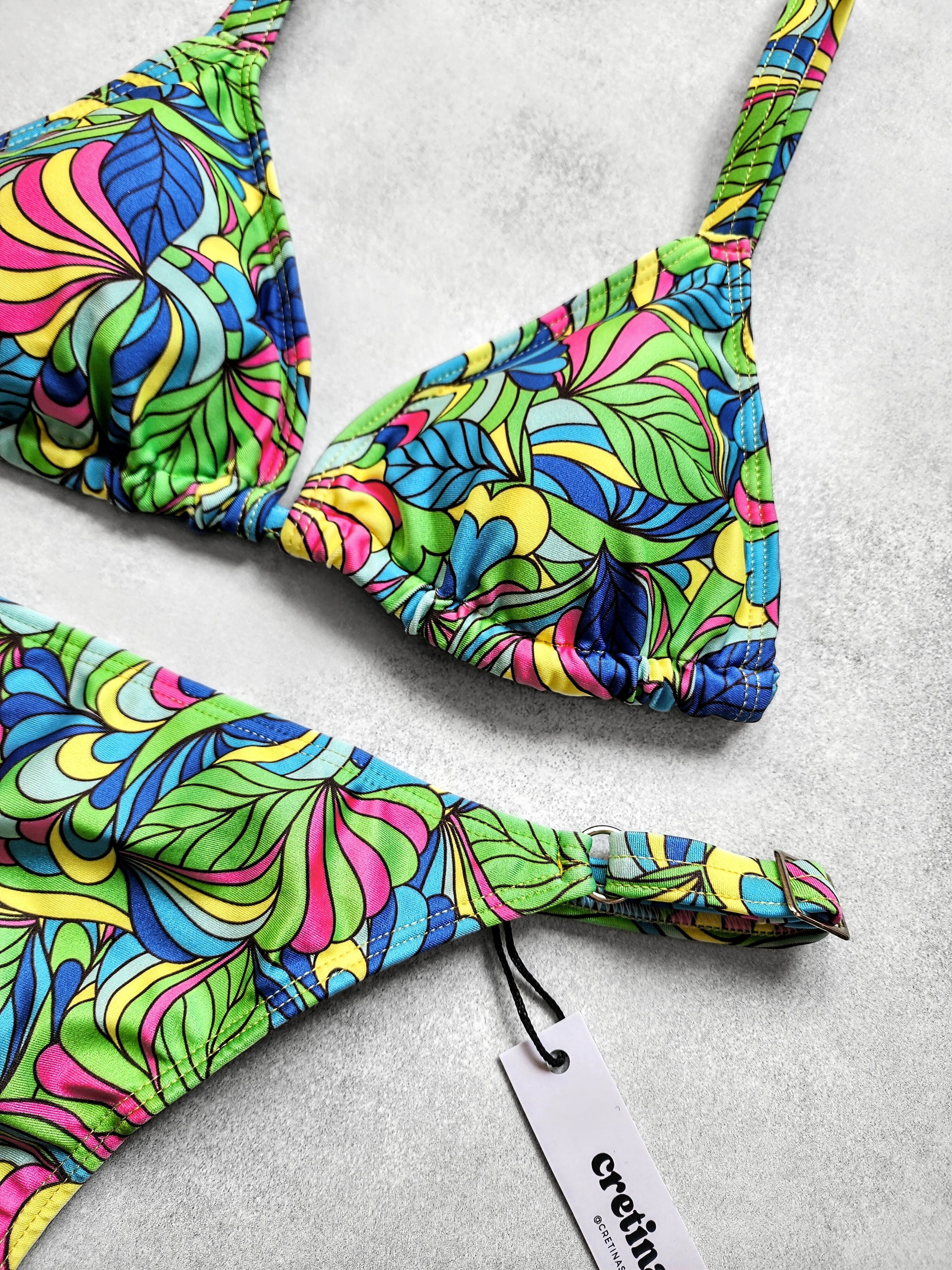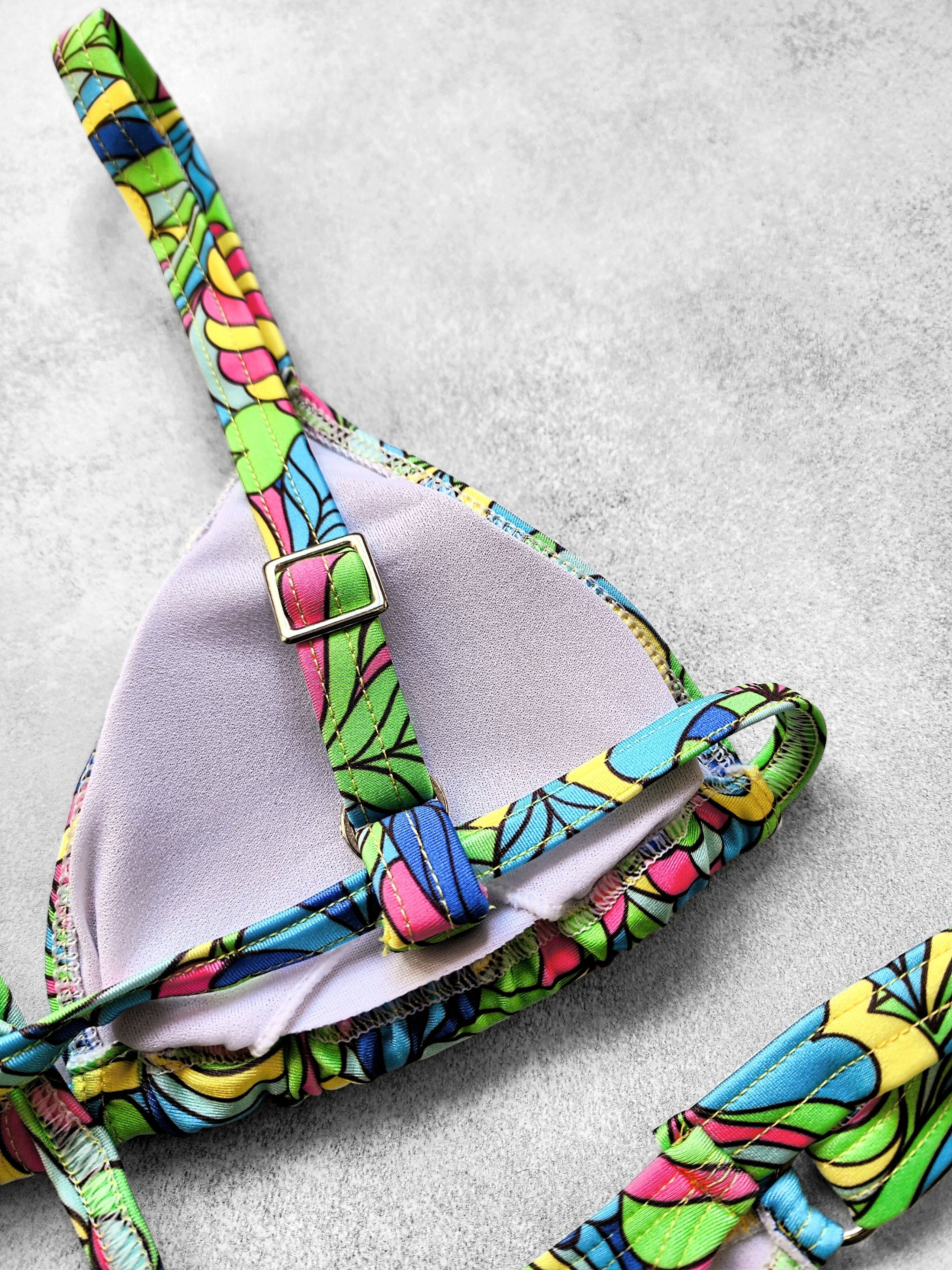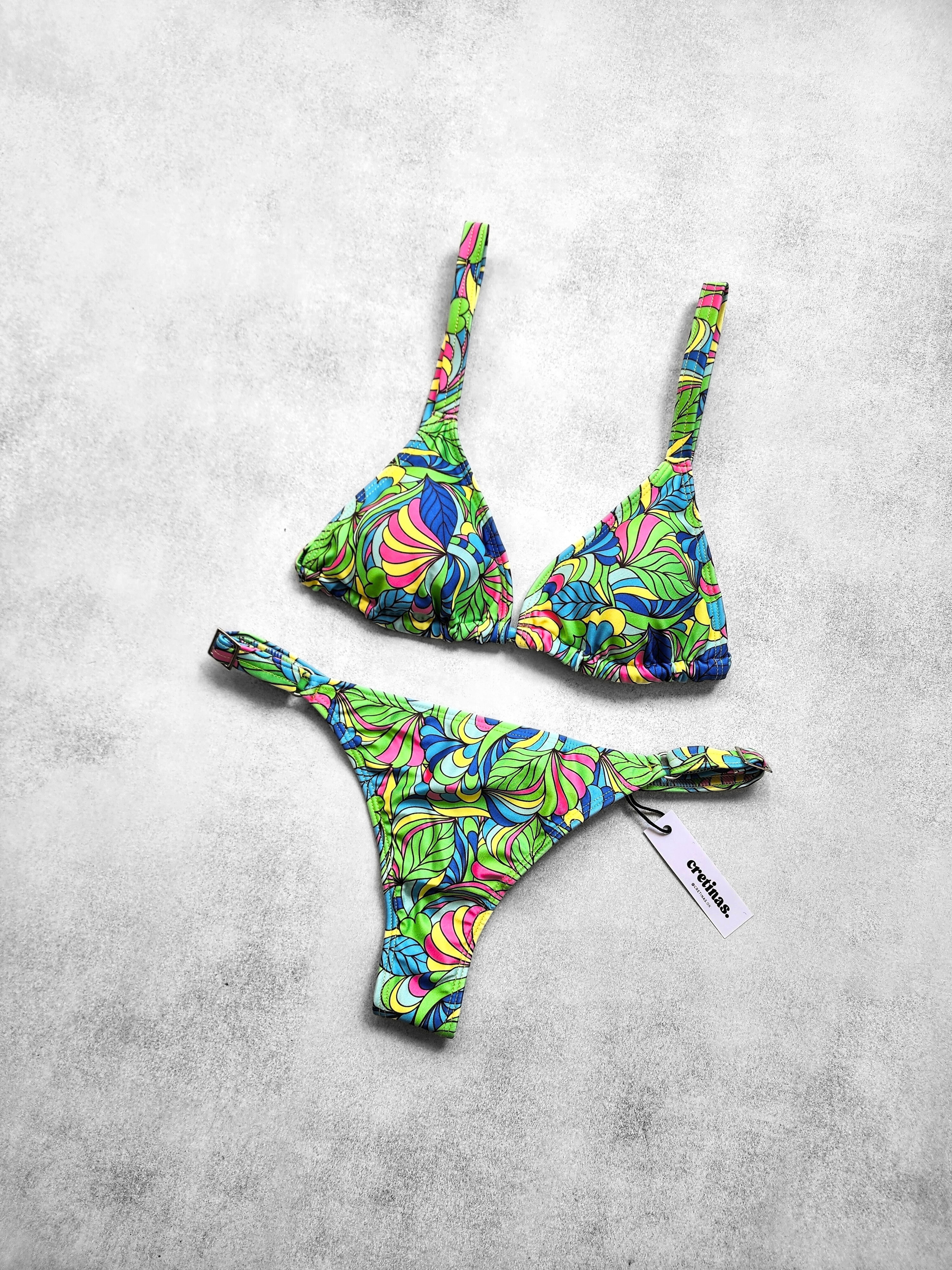 Conjunto estampado tricot. Corpiño triángulo con breteles regulables y tazas desmontables. Bombacha less regulable (breteles anchos)