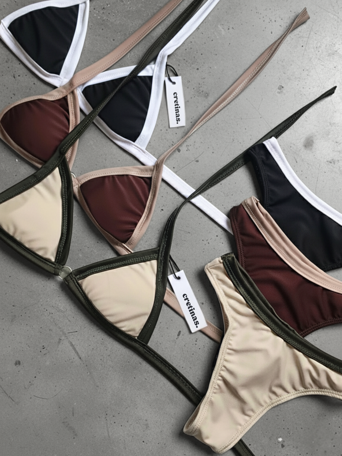 Conjunto combinado. Corpiño triángulo fijo para atar con argollita en el centro y tazas desmontables. Bombi en V