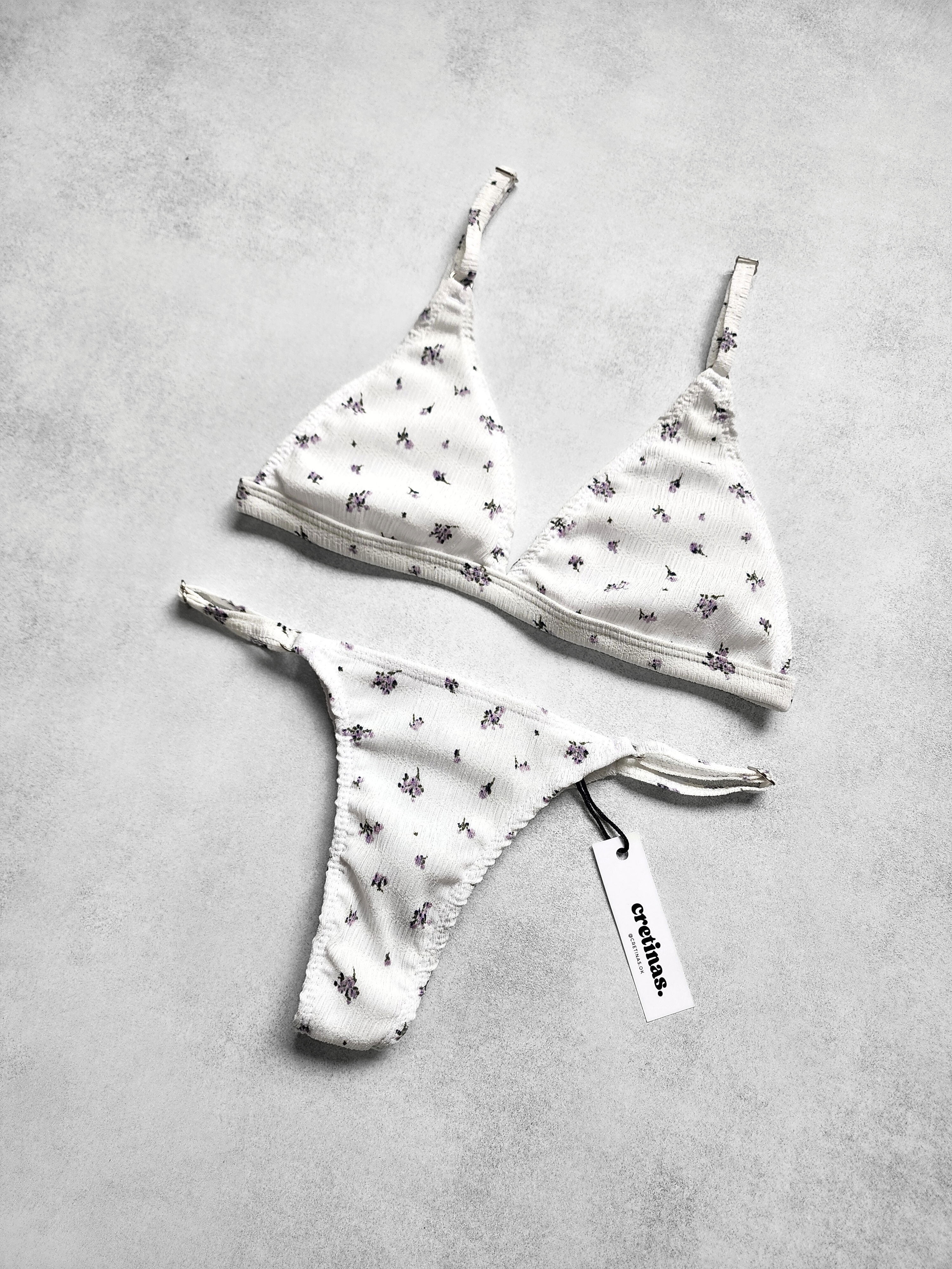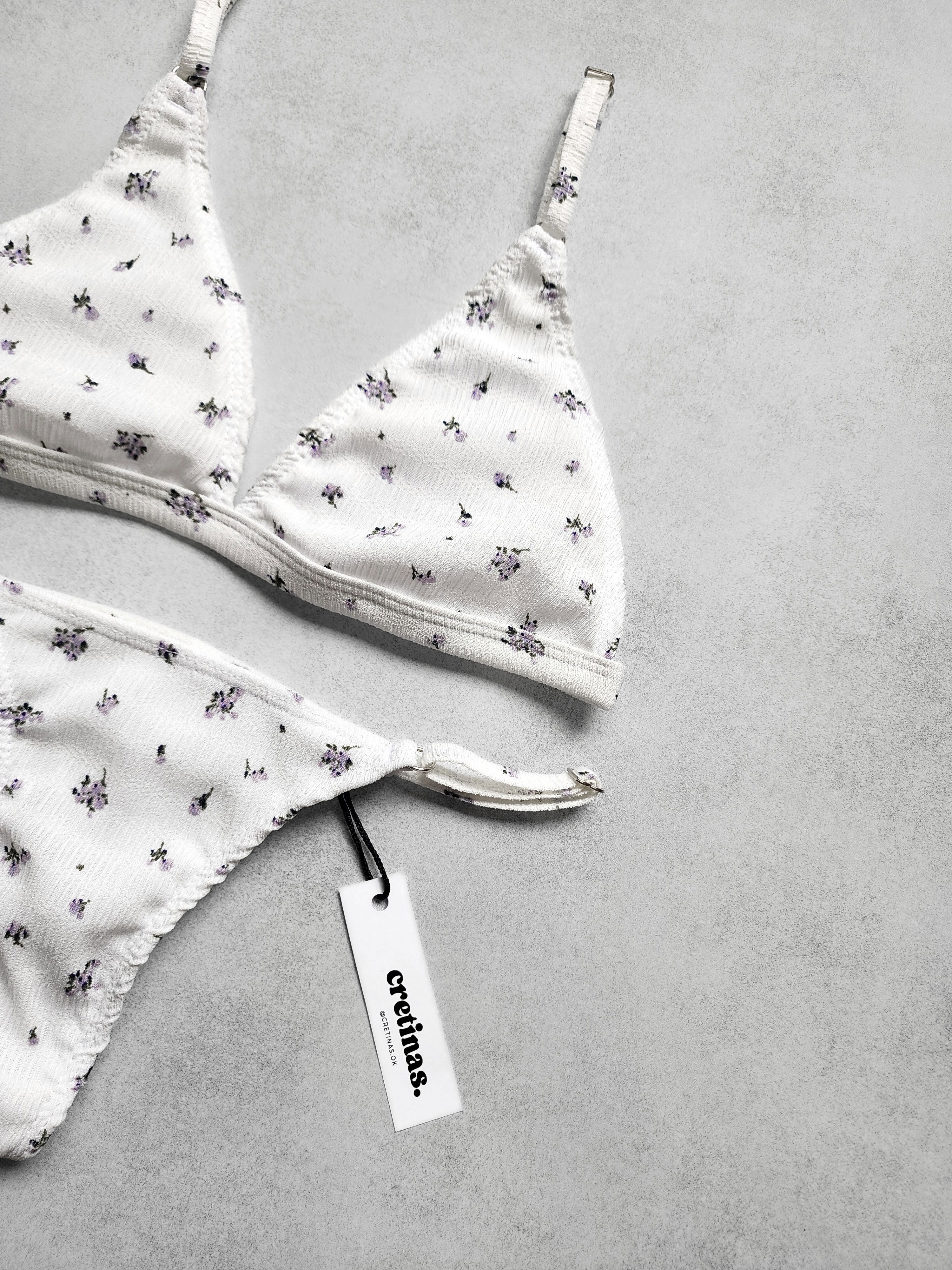 Conjunto estampado. Corpiño triángulo fijo con breteles regulables, tazas desmontables y broche para prender. Bombacha less regulable