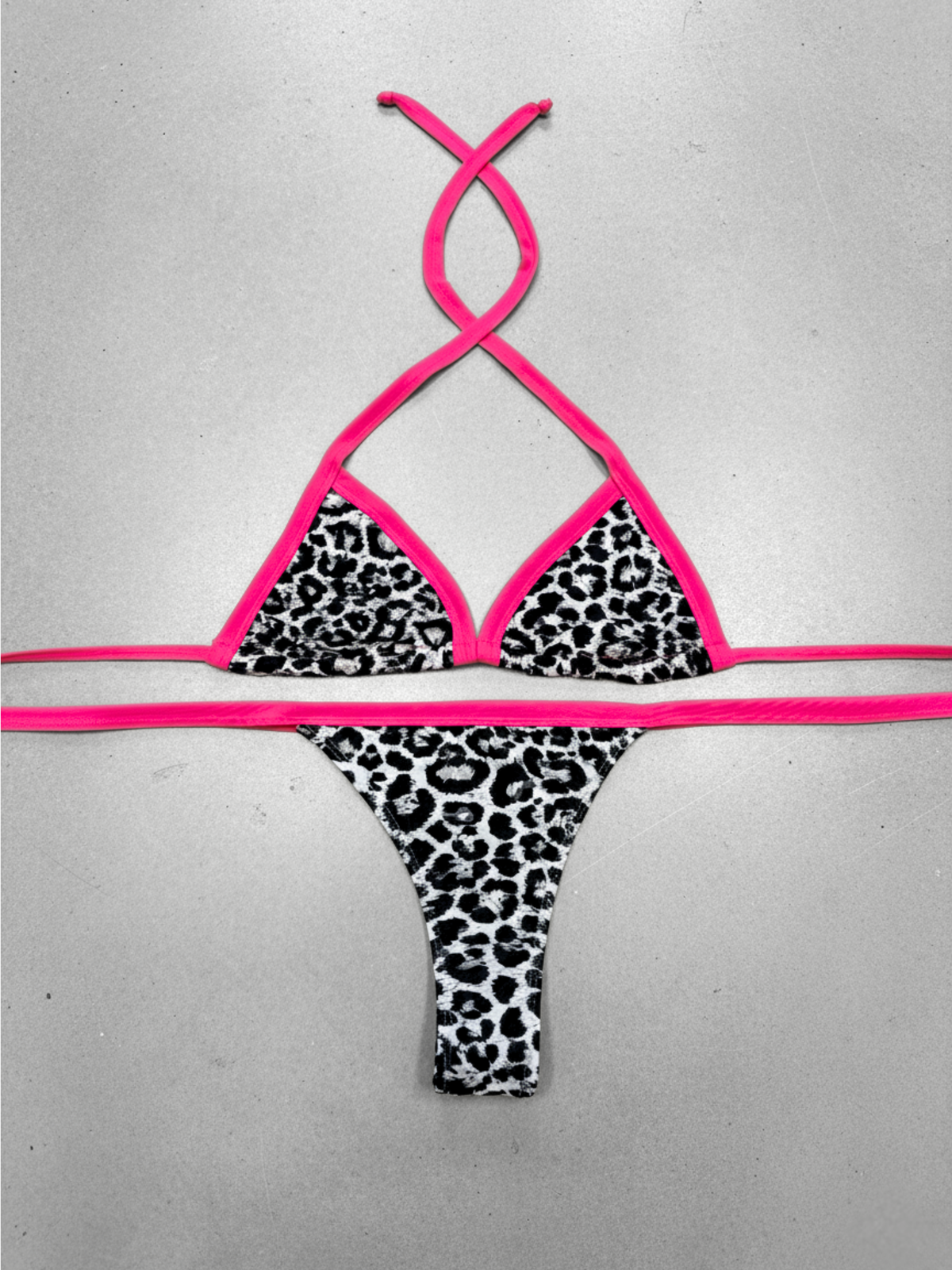 Conjunto completamente forrado con vivos en color fucsia fluor. Corpiño triángulo para atar con abertura para colocar tazas. Bombacha less para atar