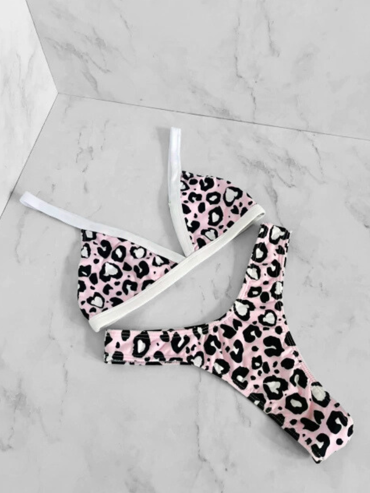 Conjunto completamente forrado con vivos en color negro. Corpiño triángulo fijo y con abertura para colocar tazas. Bombacha less para atar