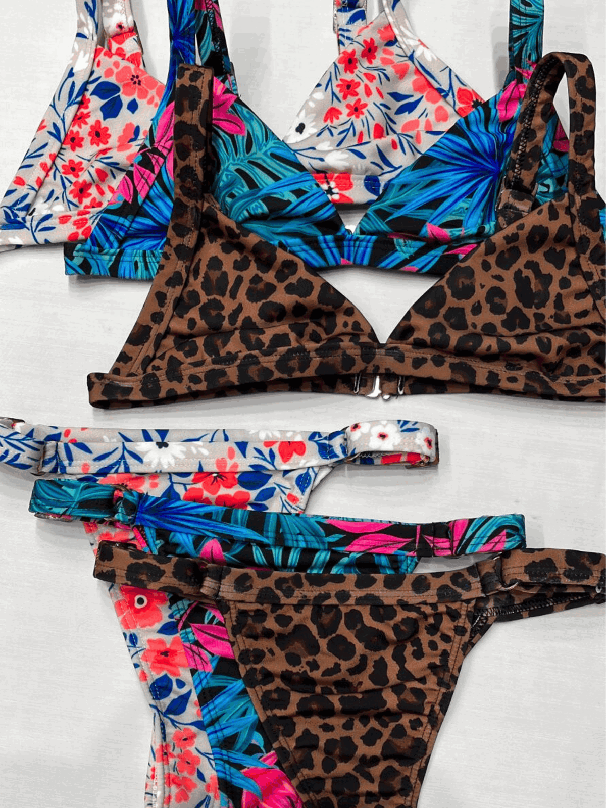 Conjunto de lycra premium protección UV, completamente forrado. Corpiño triángulo fijo con broche en espalda para prender, breteles regulables. Bombacha less regulable. Detalle de correderas en forma de cuadrado que le da un toque original.