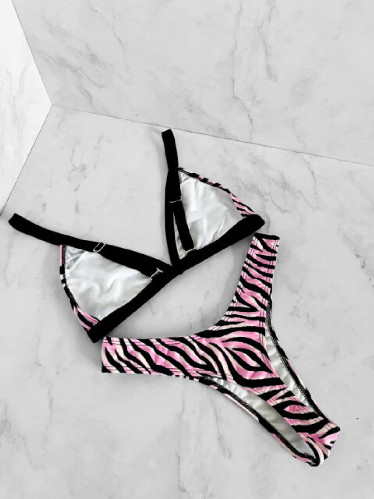 Conjunto completamente forrado con vivos en color negro. Corpiño triángulo fijo y con abertura para colocar tazas. Bombacha less para atar