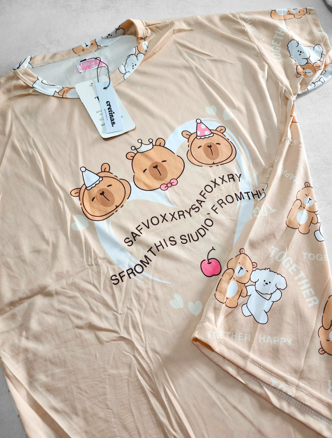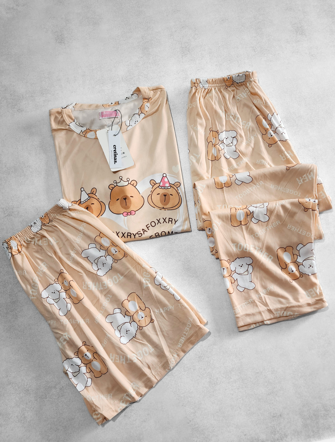 Pijama importado 3 piezas: remera manga corta, short con cintura elastizada y pantalón largo con cintura elastizada.